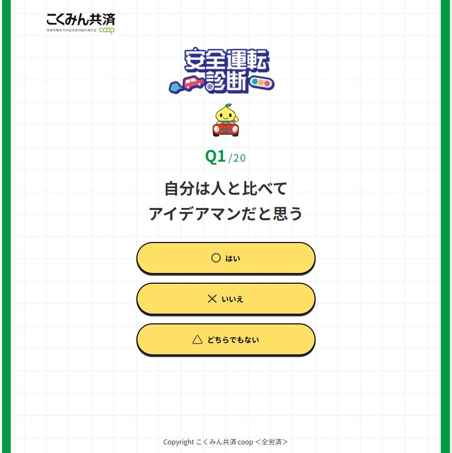 こくみん共済 coop〈全労済〉(全国労働者共済生活協同組合連合会 代表理事 理事長:打越 秋一)は、運転者の性格上の特性から運転のタイプを診断し、事故抑制に繋げるヒントを提供する無料コンテンツ『安全運転診断』を、9月19日(金)から提供開始します。