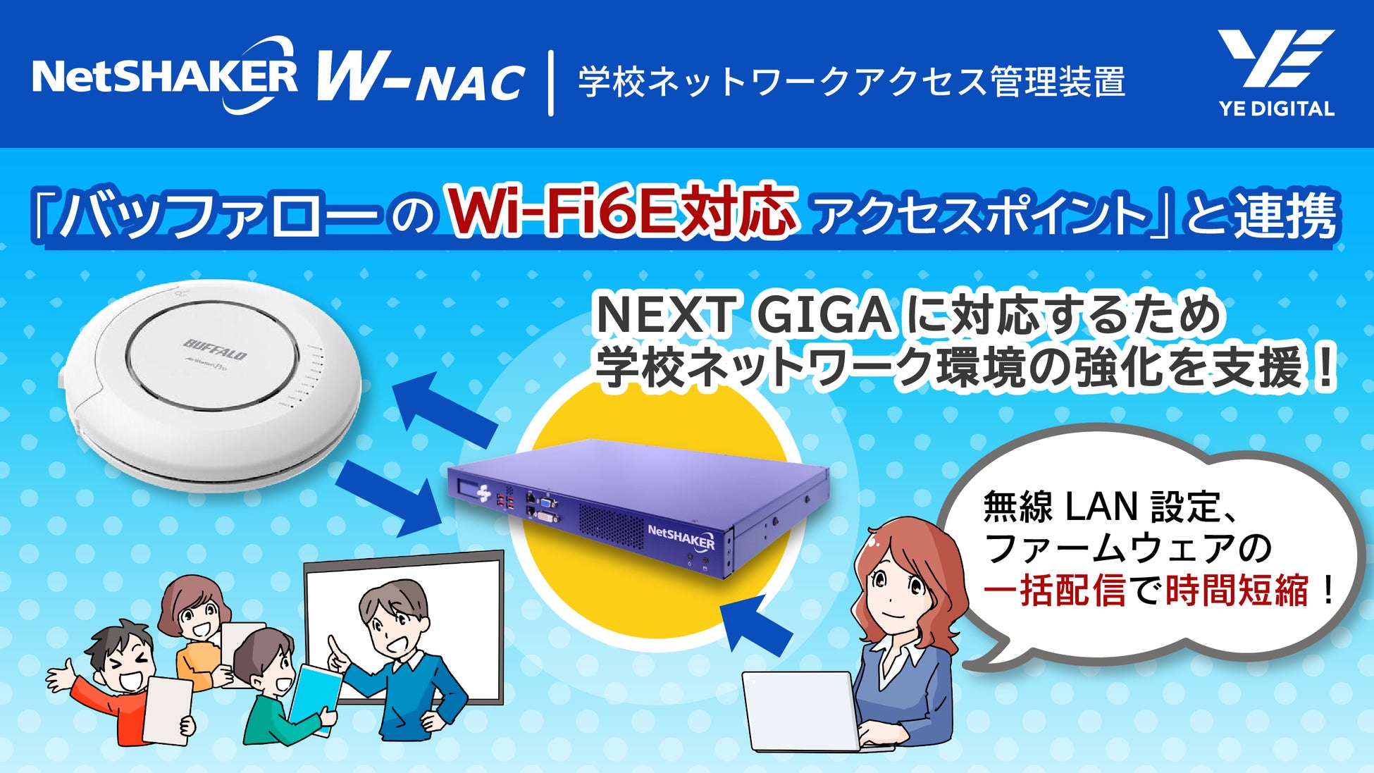 このことから、YEデジタルはネットワーク環境の最適化を目指し、各社の無線アクセスポイントの最新機種との連携を進めています。今回はその一つ目として、バッファローのWi-Fi6E対応アクセスポイントと連携いたしました。