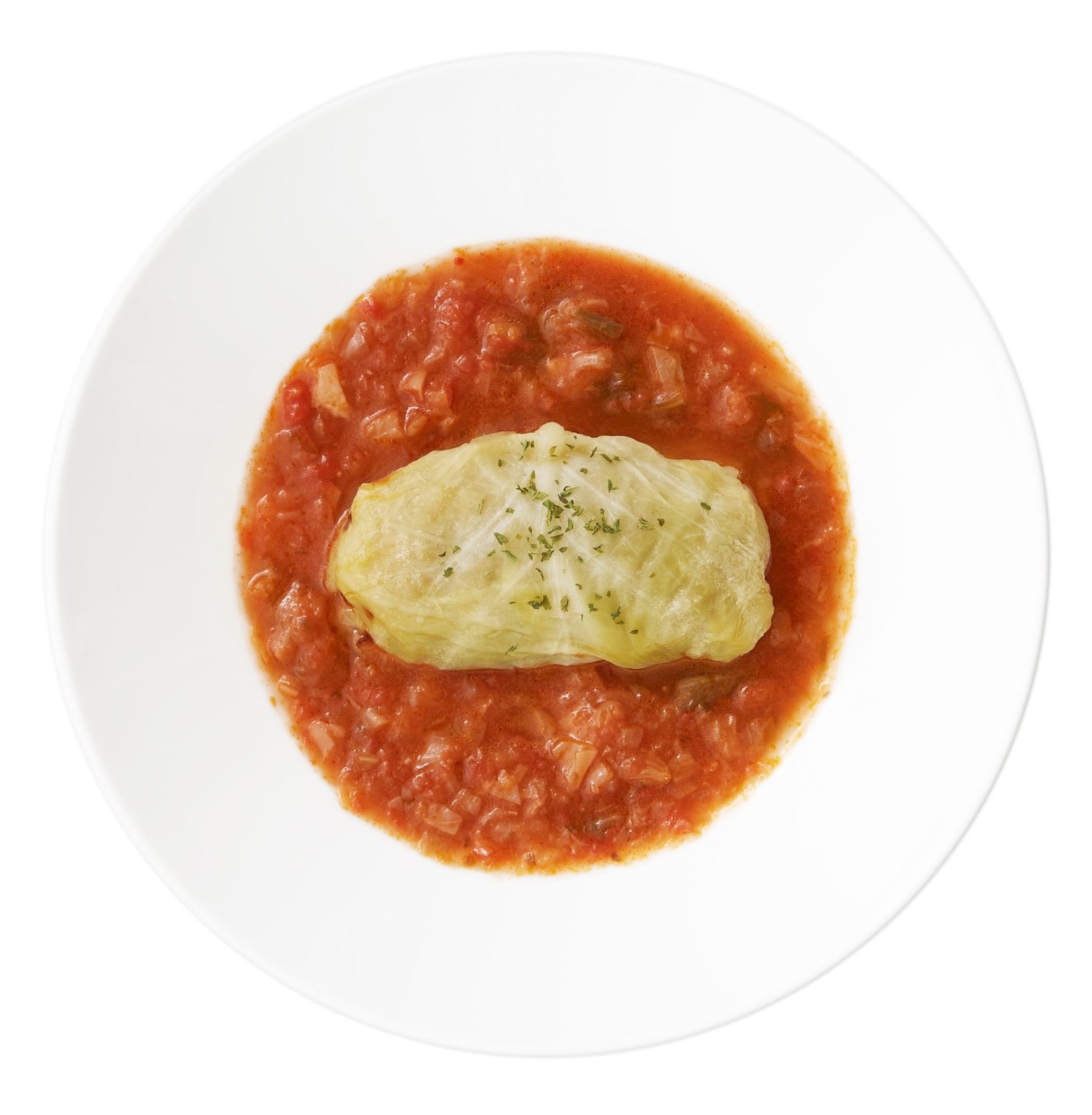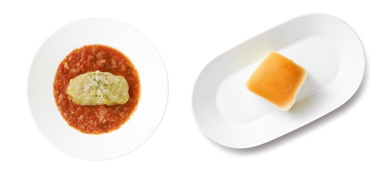 ヘルシーなおからこんにゃくを使用したプラントベースのロールキャベツは、以前販売していた大豆ミートを使用したロールキャベツよりもさらに低カロリー。使用されている材料には、おからは、豆腐や豆乳を作る過程で捨てられてしまうものを活用していたり、トマトスープにはキャベツの端材が活用されていたりと、環境に優しくサステナブルな一品です。お得なディナーロール付きです。