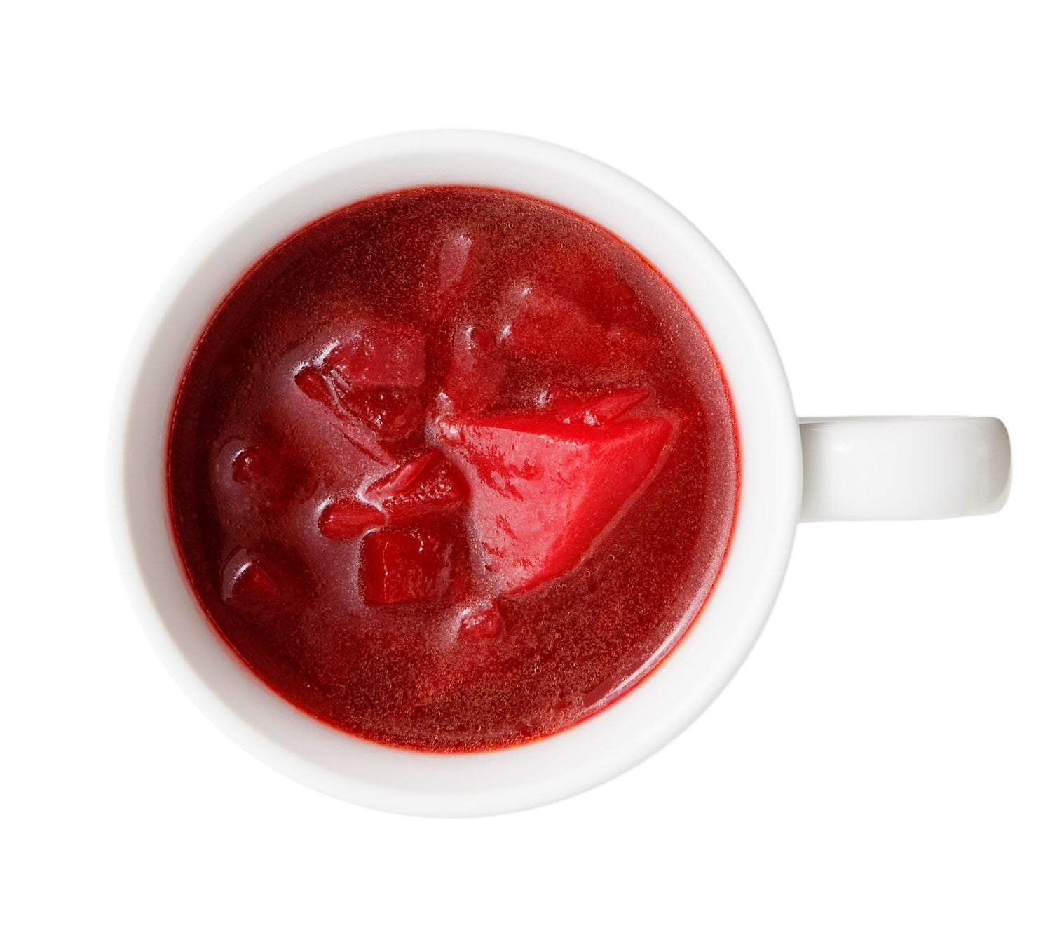 野菜がたっぷり入った、色鮮やかなビーツのボルシチ。プラントベースのメニューです。