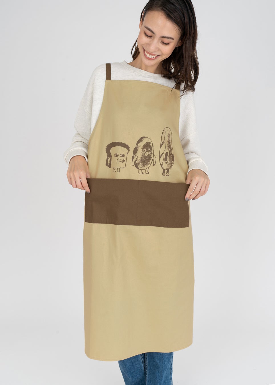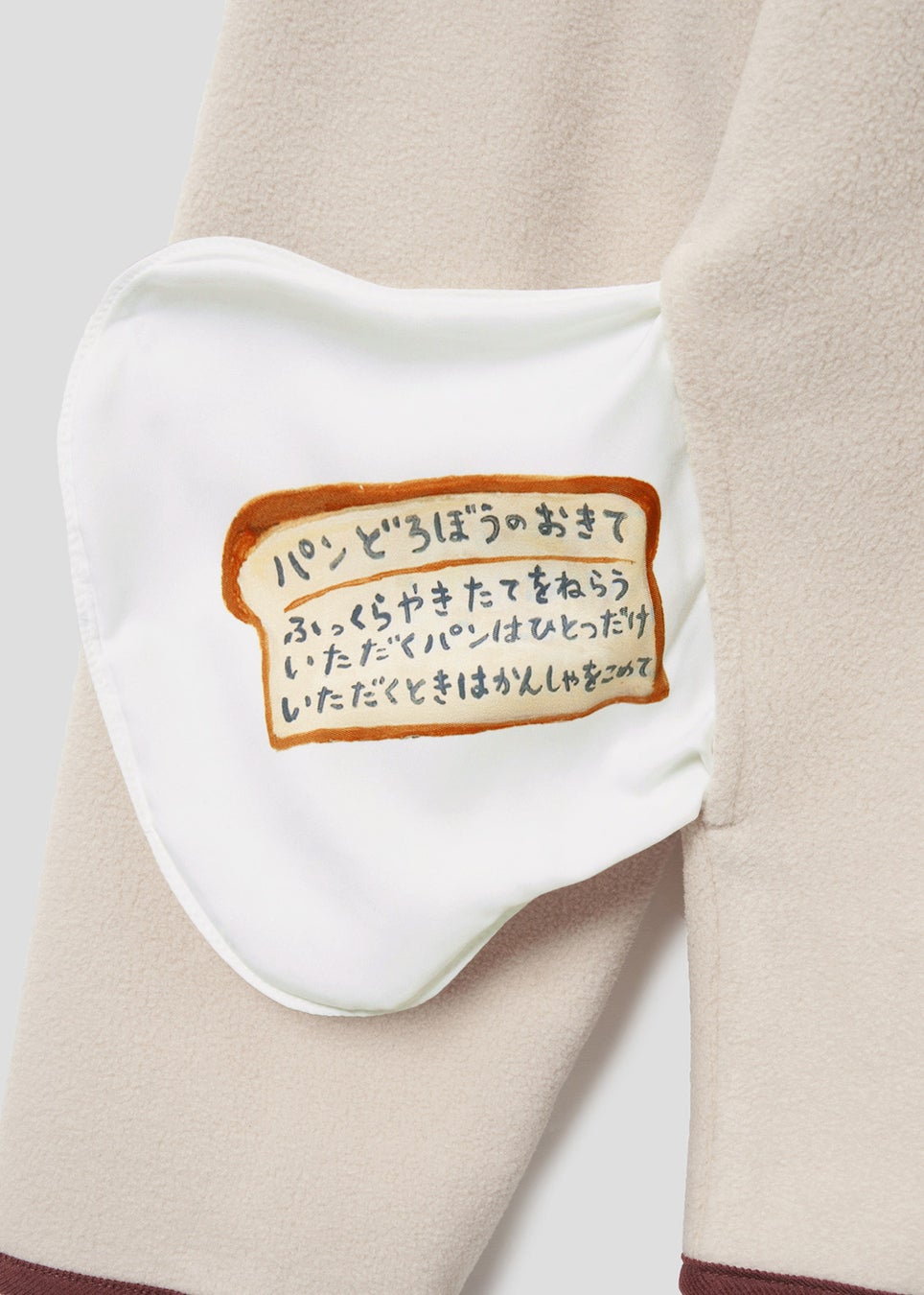 パンどろぼう、にせパンどろぼう、なぞのフランスパンが並んだシュールなデザイン。裾には、それぞれが変装していたパンの被り物と、食パンから顔をのぞかせるパンどろぼうの姿が!