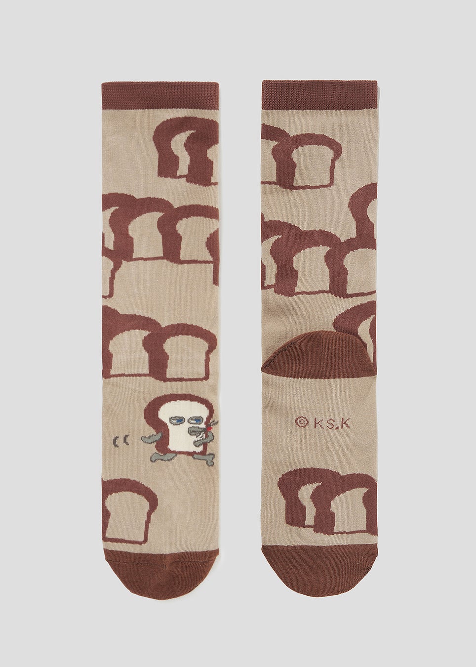 並んだ食パンをパターンにした1足。足の甲には「はやあしのじゅつ」でサササッと移動するパンどろぼうがデザインされています。細かなグラフィックをジャカード編みで表現したソックス。