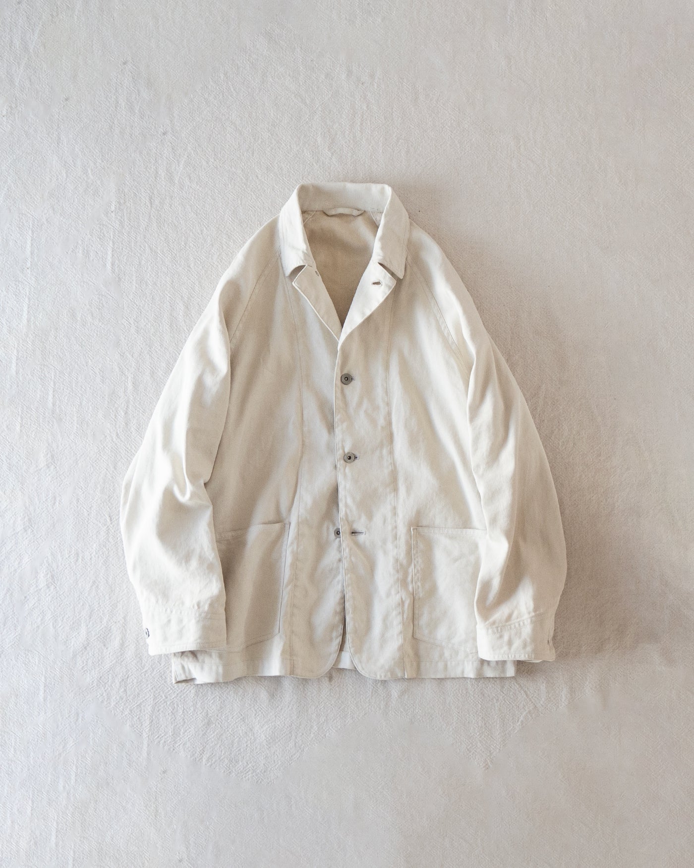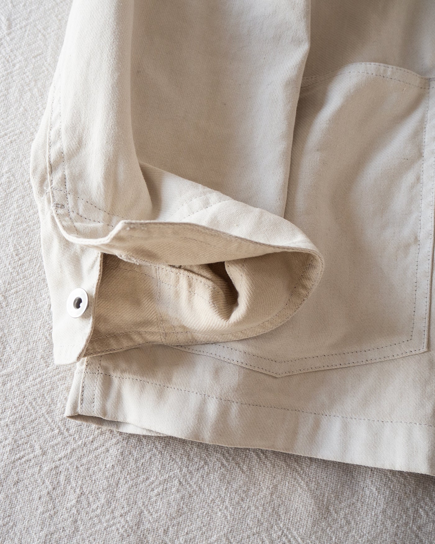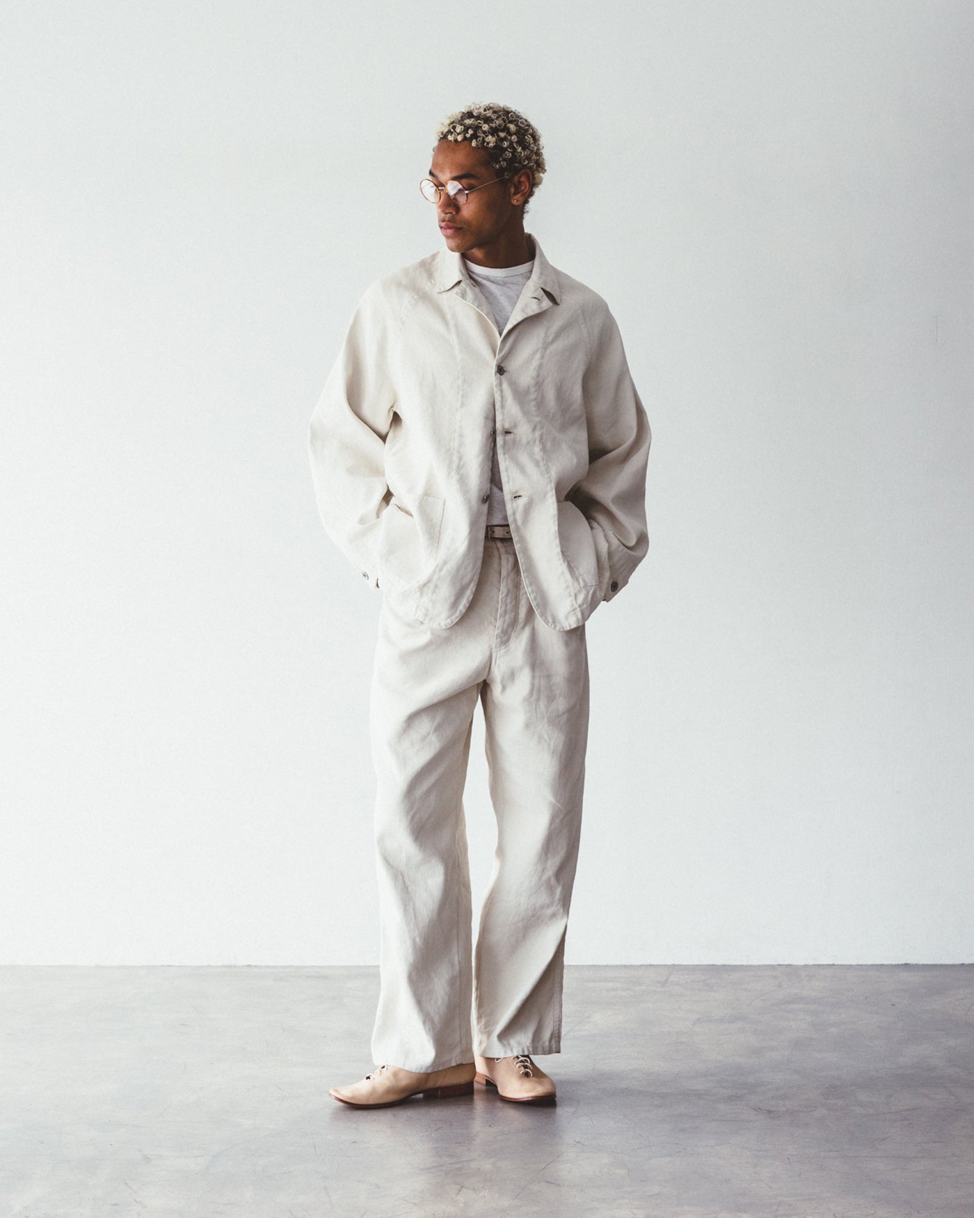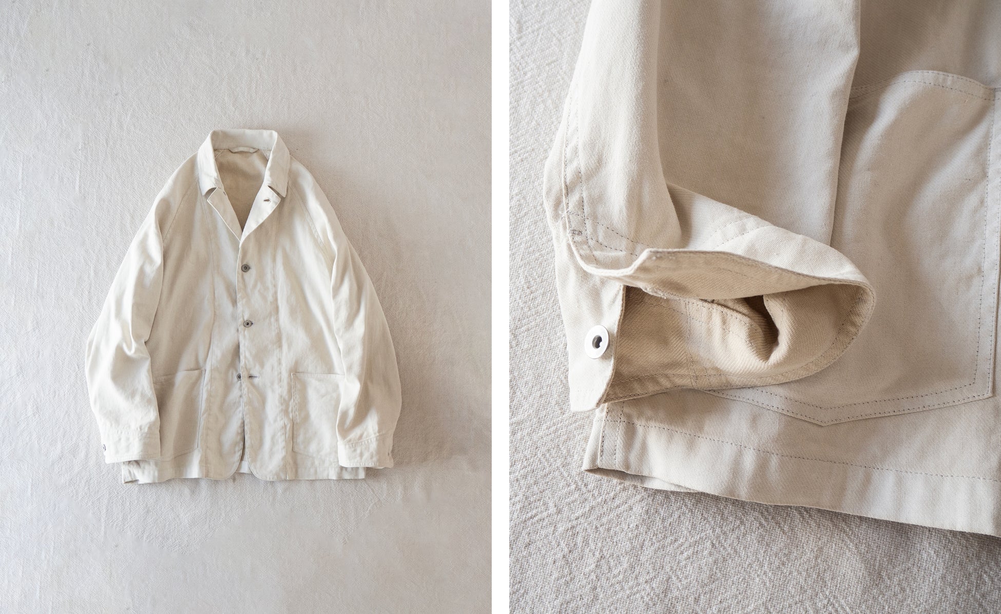 デニムやダックという無⾻な⽣地感に加え、簡素なパタンニングが特徴となった50年代の物資統制下におけるワークカバーオール。運動量のある⼤ぶりな形状や、直線的なカットもこの年代のワークウェアを象徴とするアウトラインを残しながら、当時には⾒られない、リネン素材をベースとした⽣地を落とし込みました。