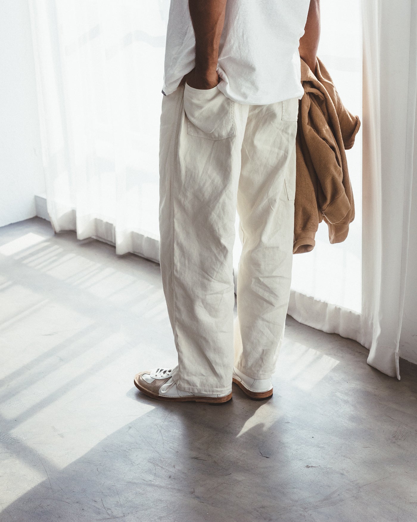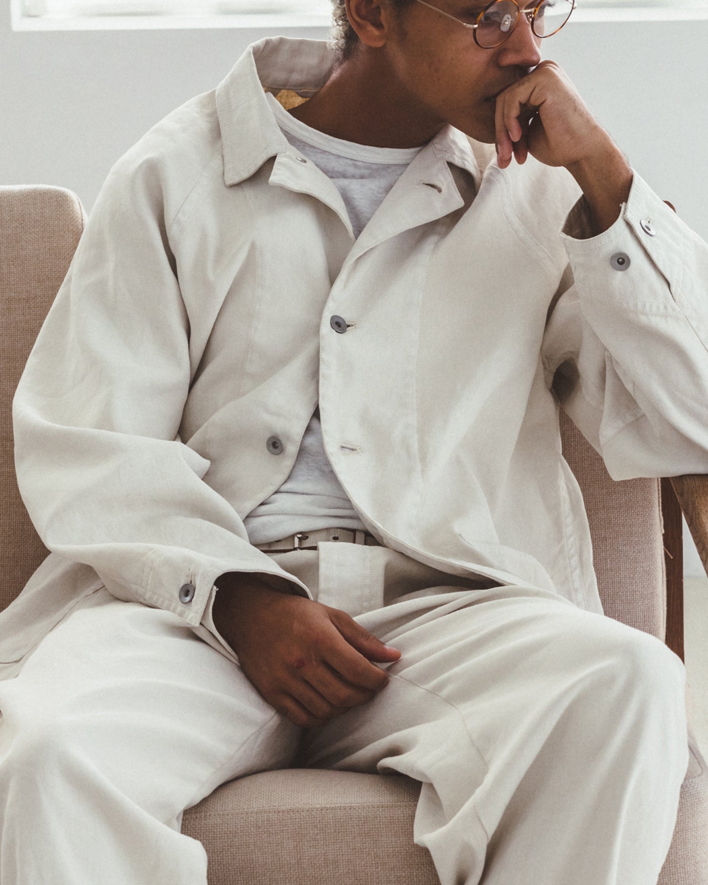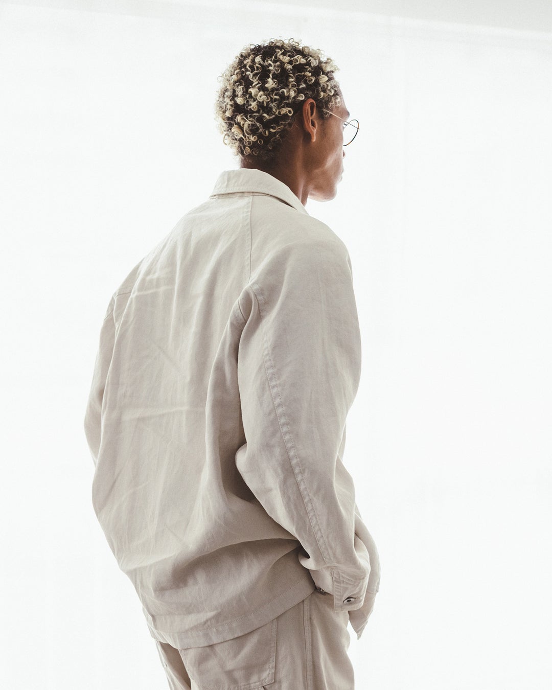 着⽤時には、体の動きに合わせた⽣地の揺れやシワ、それによる陰影が⽣まれ、表情豊かな顔つきに。元々のワークウェアにはない、緩みがあり、⼒の抜けた雰囲気が漂います。