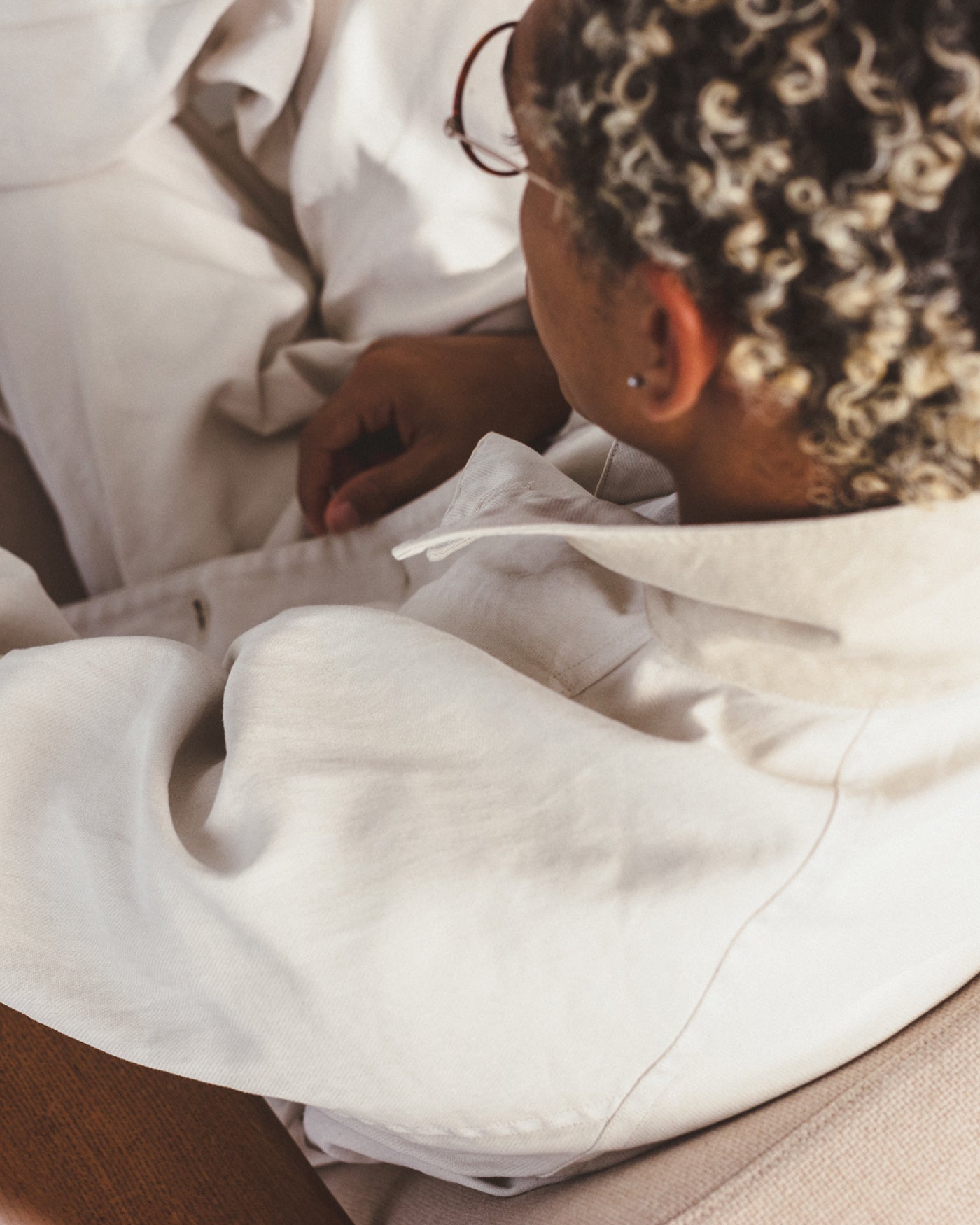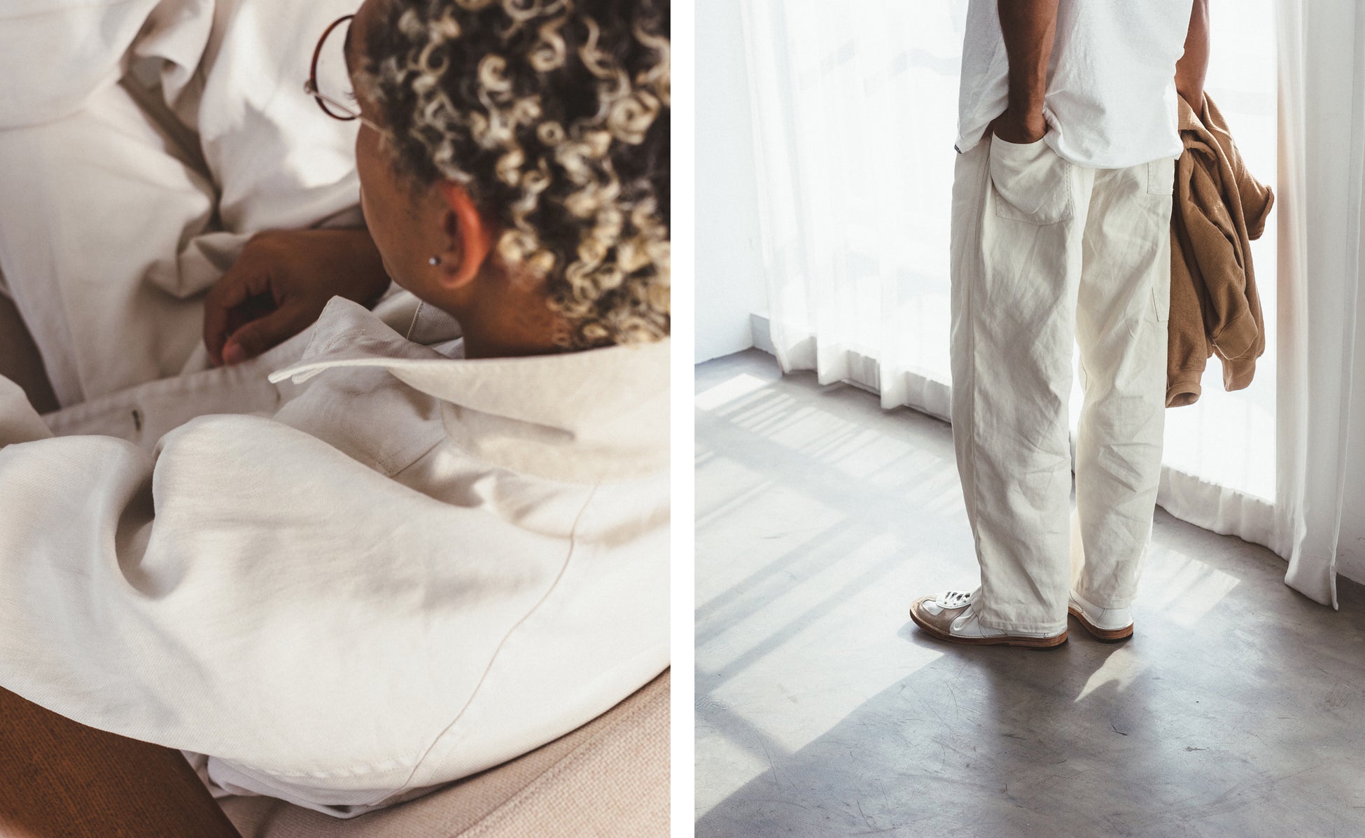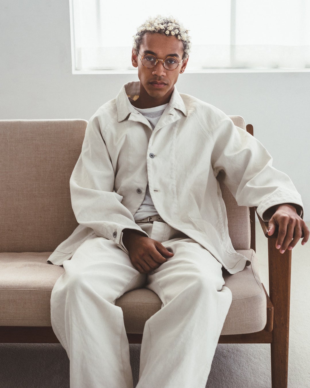 着⽤時には、体の動きに合わせた⽣地の揺れやシワ、それによる陰影が⽣まれ、表情豊かな顔つきに。元々のワークウェアにはない、緩みがあり、⼒の抜けた雰囲気が漂います。