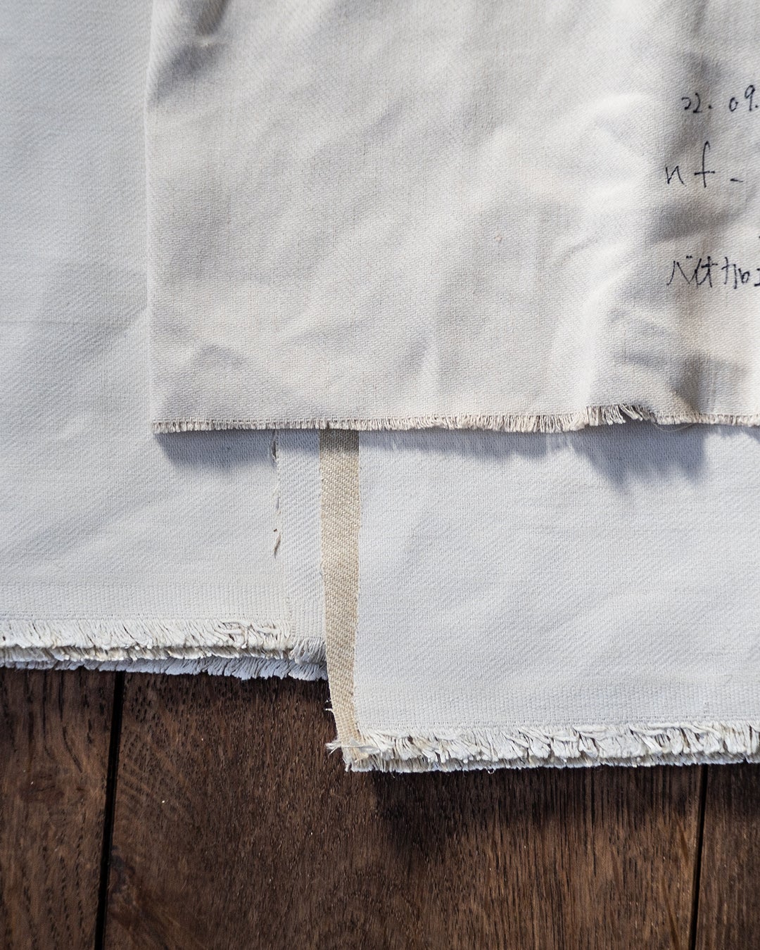 ⽣地は、元々リネンとコットンの⽣成⾊を⽣かした織物。その表⾯に、ホワイト顔料を満遍なくプリントすることで、例えるならペンキで塗り⽴てた壁のようなファブリックでした。