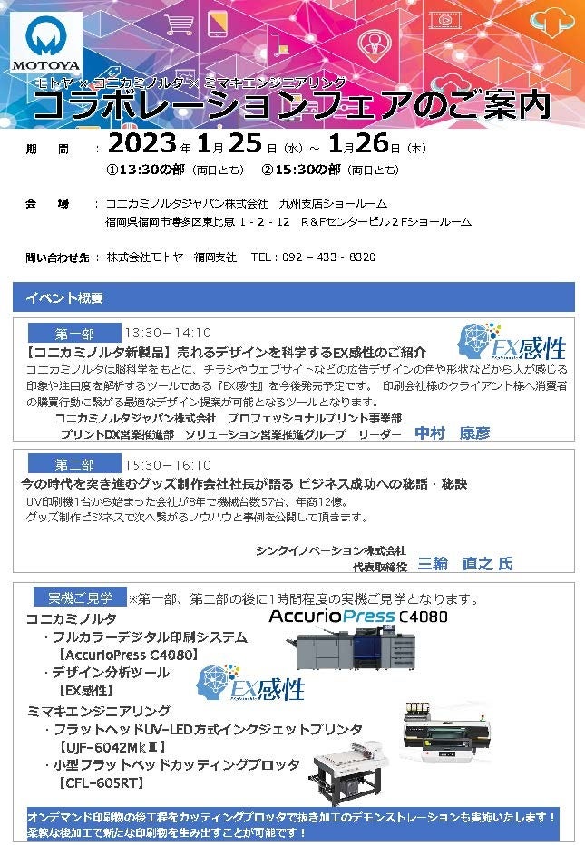 コニカミノルタジャパン㈱九州支店ショールームにて開催される【モトヤ×コニカミノルタ×ミマキエンジニアリング】コラボレーションフェアにて、シンクイノベーション㈱がセミナーを実施いたします!