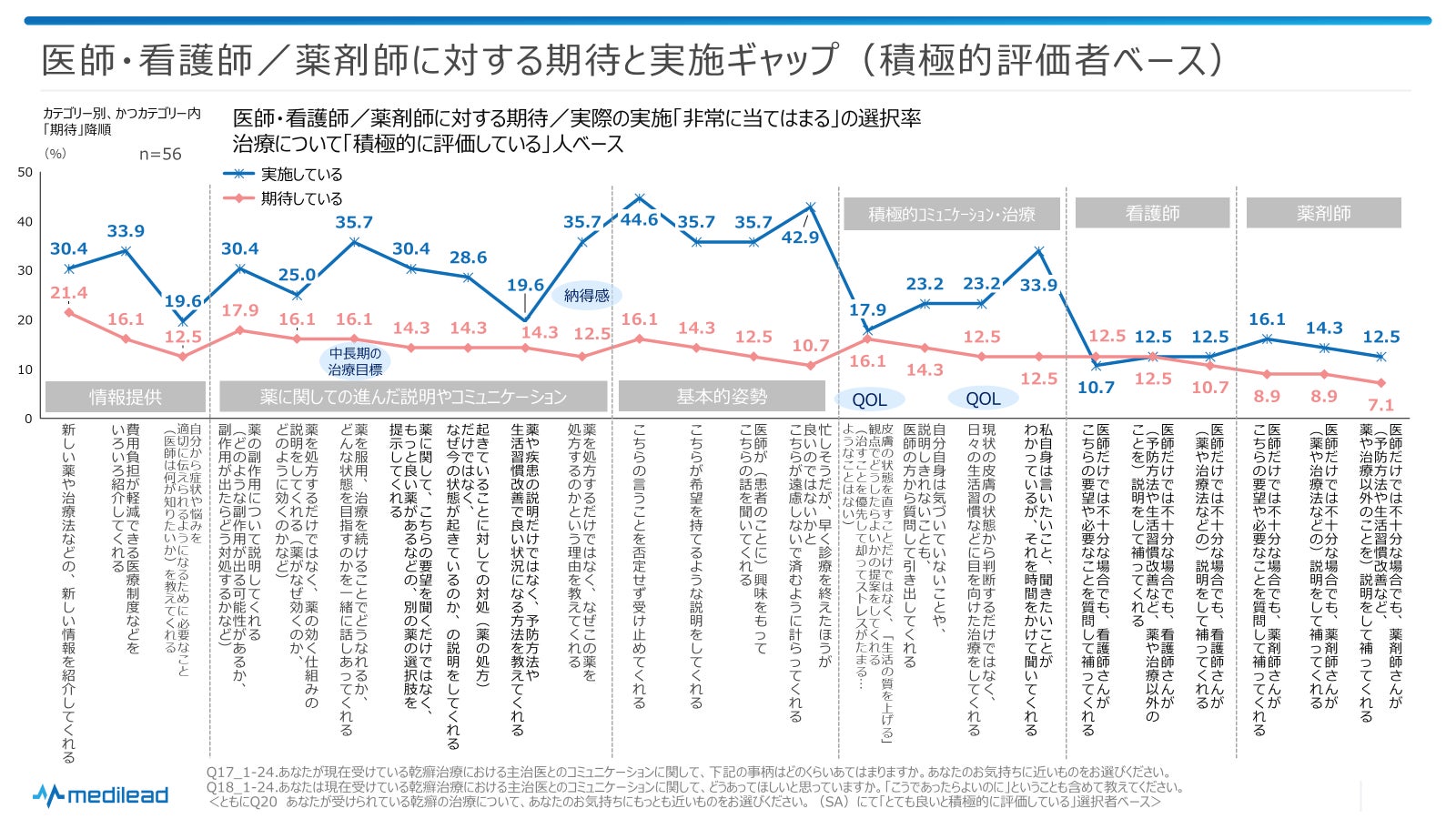 今回の調査結果から、患者による治療の「積極的評価」は、医師とのコミュニケーションが実施されている(と患者が感じている)場合に、特に高くなることが明らかになりました。ただし、患者の「期待」が大きい項目が「実施」されていれば評価が高くなるとは限らないこともわかりました。
