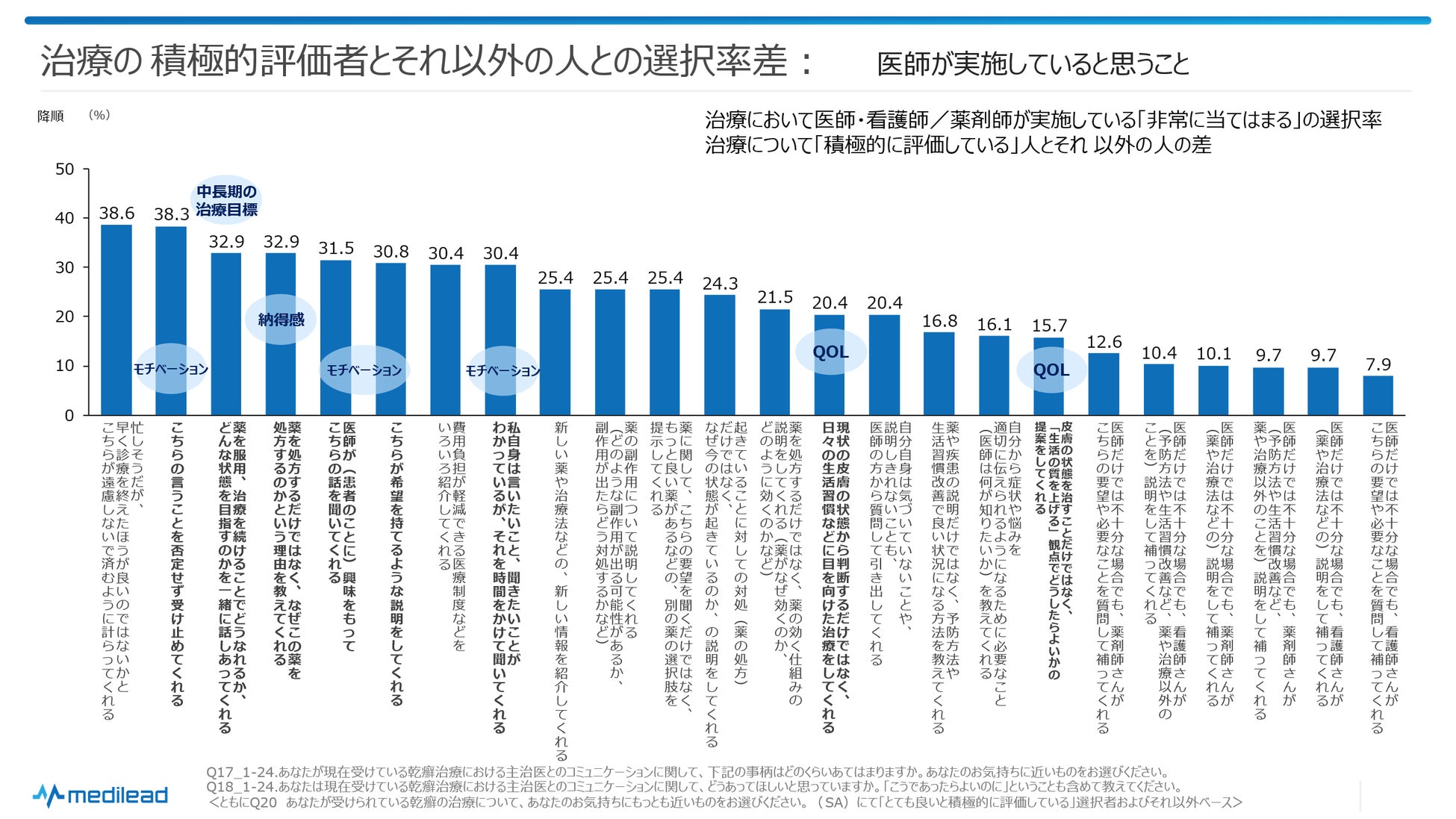 「医師が実施している」と回答(=『非常に当てはまる」を選択)した割合について、治療を積極的に評価している人とそれ以外の人の選択率の差が大きい順に並べたものです。