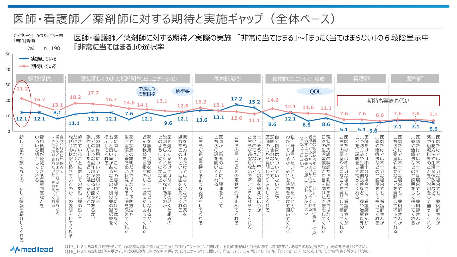 乾癬治療における主治医・看護師・薬剤師とのコミュニケーションに関して「実施していると思う内容(=実施)」、「こうあってほしいと思う内容(=期待)」のそれぞれについて、同一の24項目を呈示し、評価してもらいました。