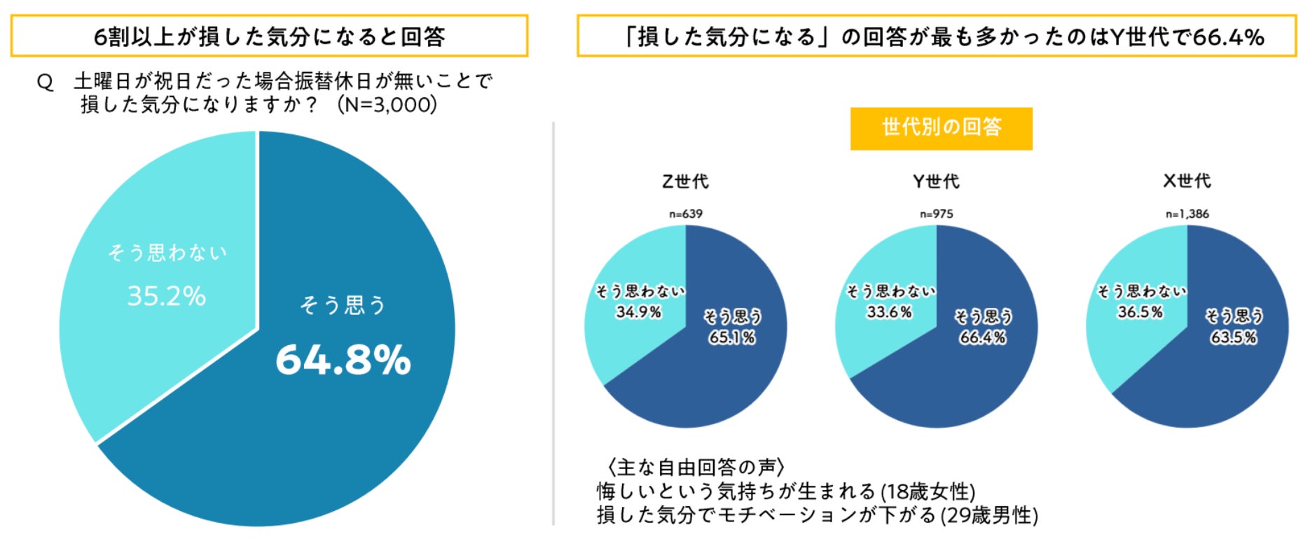 土曜日が祝日だった場合、振替休日が無いことについて、全体の64.8%が「損をした気分になる」と回答。「損をした気分になる」の回答が最も高かったのがY世代で、66.4%という結果に。