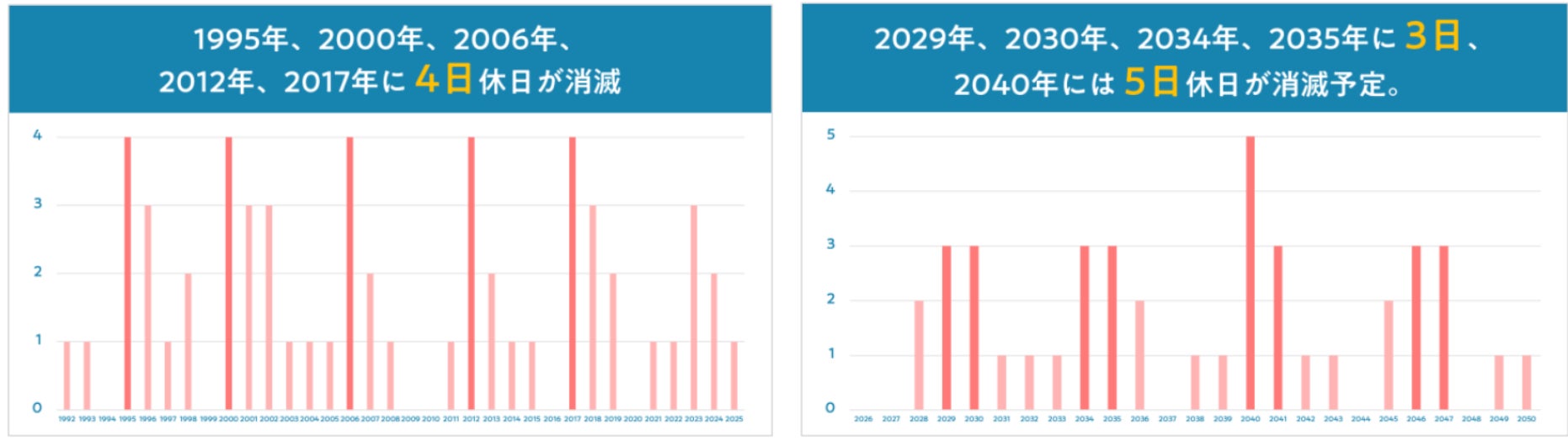1995年、2000年、2006年、2012年、2017年に4日、 2040年には5日の休日が消滅する予定。