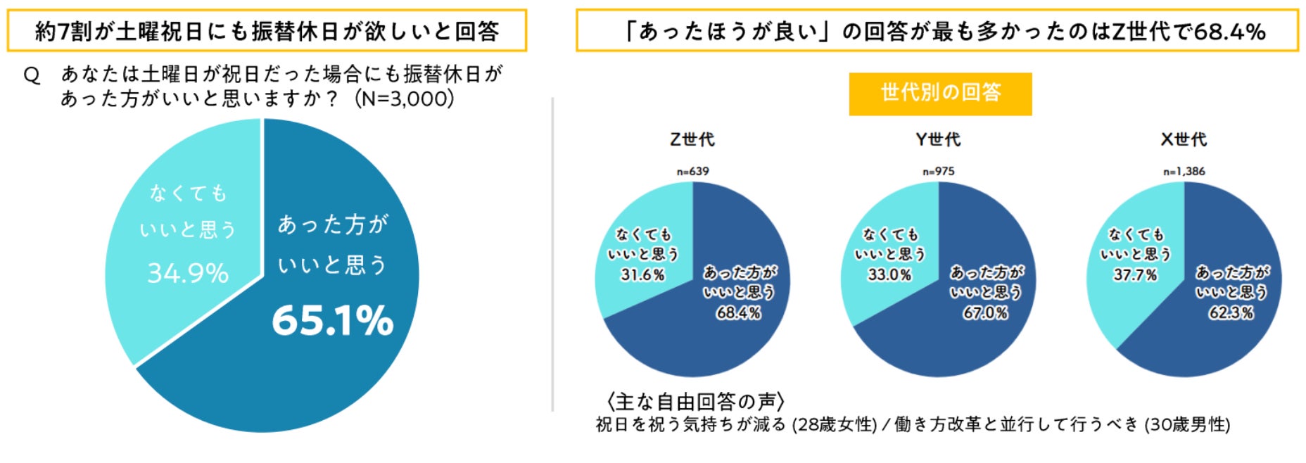 年代全性年代の中で最も「あったほうが良い」の回答が多かったのはZ世代の女性で、72.7%という結果に。自由回答としては、「祝日を祝う気持ちが減る(28歳女性)」「働き方改革と並行して行うべき(30代男性)」、「休みが少ない職場のため、土曜日が祝日だと年間の休みがさらに減って辛い。(40代 女性)」といった声が多く見られ、多くの人が土曜祝日の振替休日実現を求める人が多いことが明らかになりました。