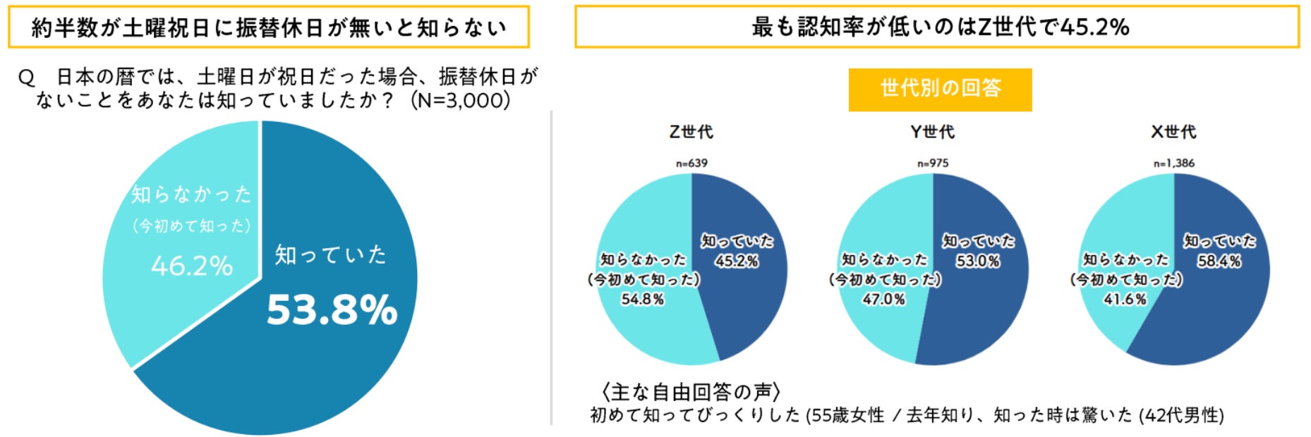 約7割の人が土曜祝日に振替休日があったほうが良いと回答した一方で、「土曜祝日に振替がないこと」の認知率はわず か53.8%という結果に。最も認知率が低い年代はZ世代でわずか45.2%。アンケートの中には「初めて知ったのでびっくりした。 昔は会社も学校も土曜日にあったけれど、今は休みのところがほとんどなので休日の扱いもそれに合わせる方が自然に思え る(50代女性)」 といったコメントも多数見られ、「#祝日キャンセル問題」が多くの人にとって 「言われてみればおかしい」と