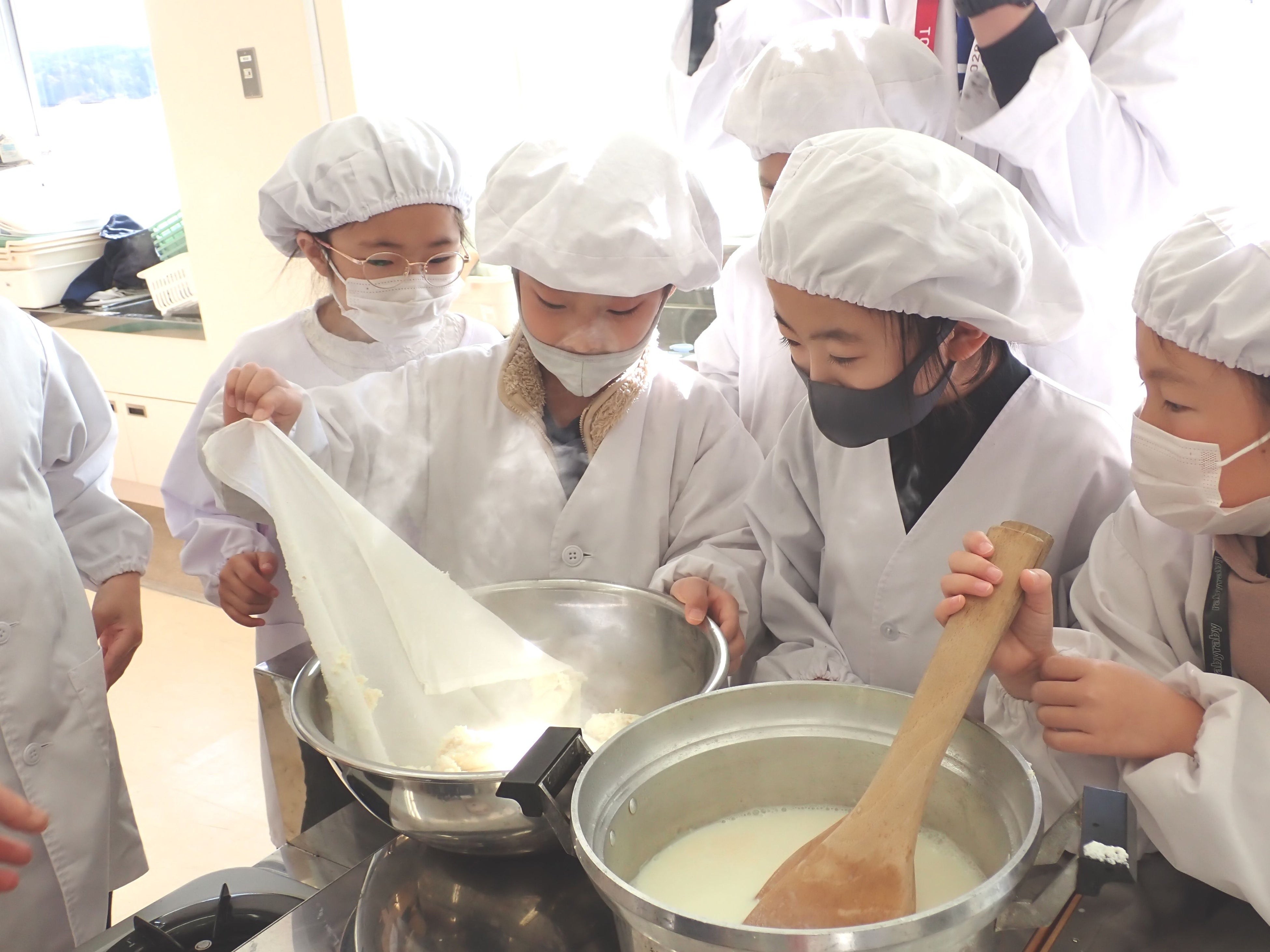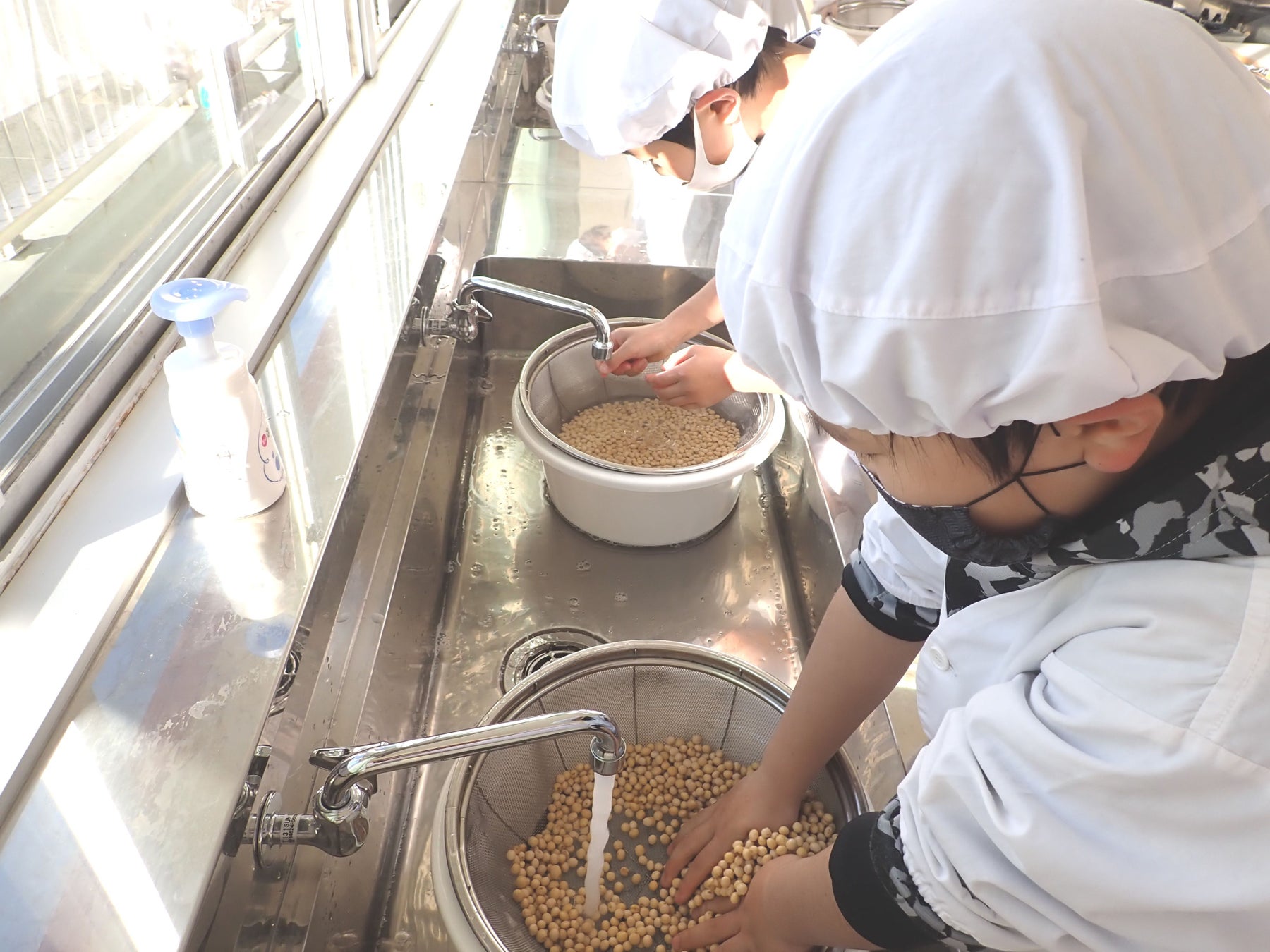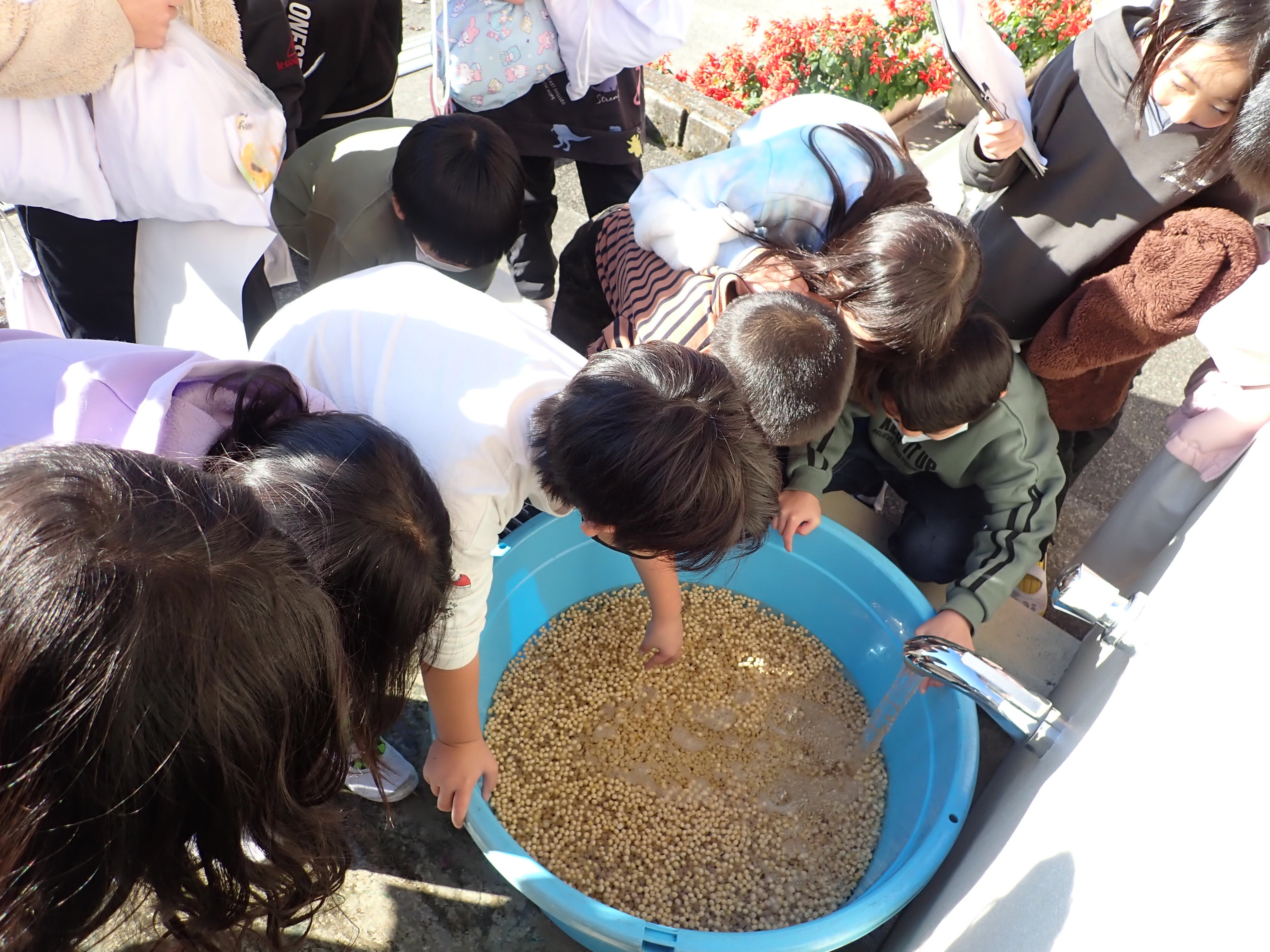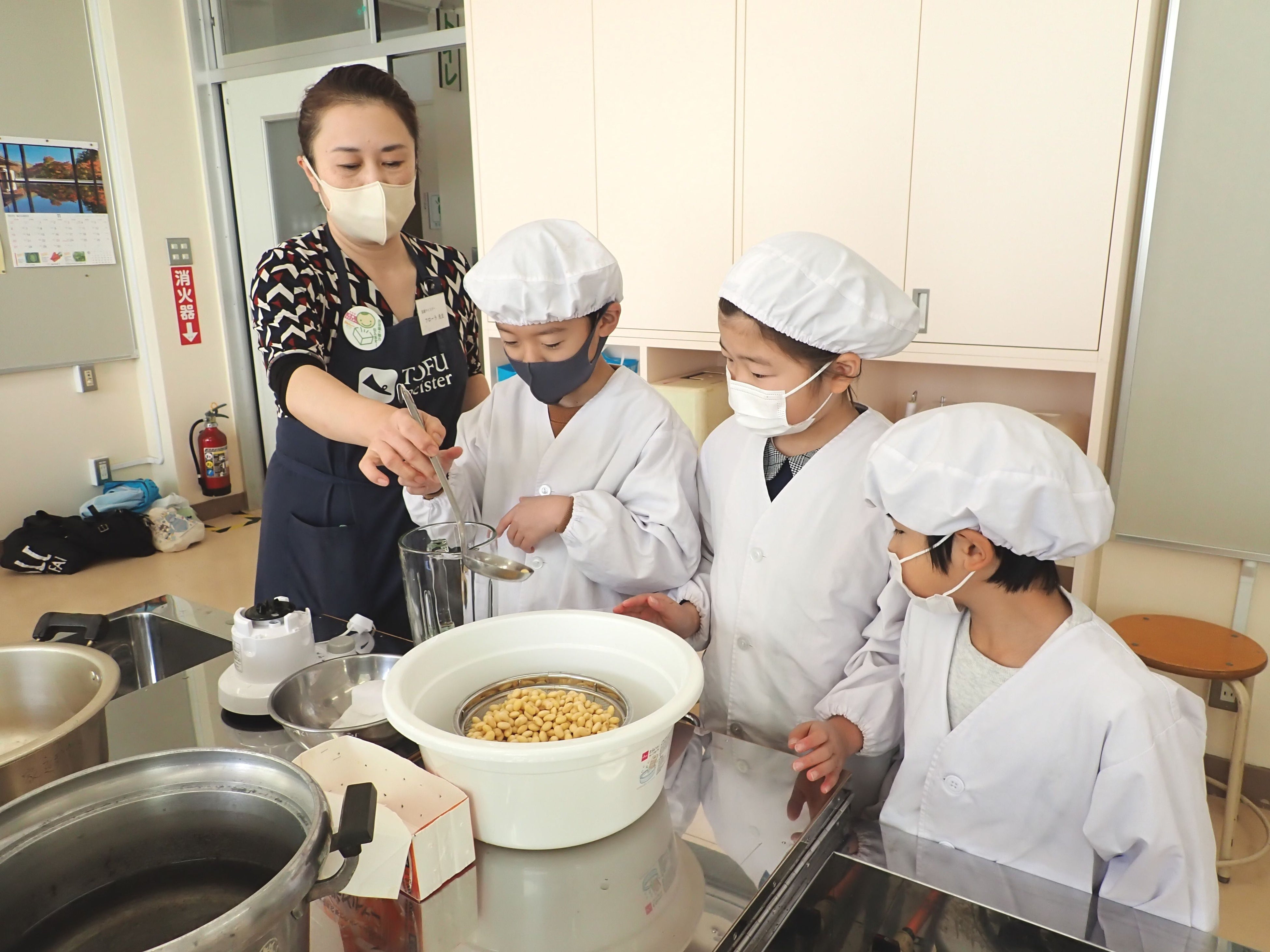 根小屋小学校3年生が自分たちで育てた大豆で「手づくり豆腐・味噌」づくりを体験しました。
