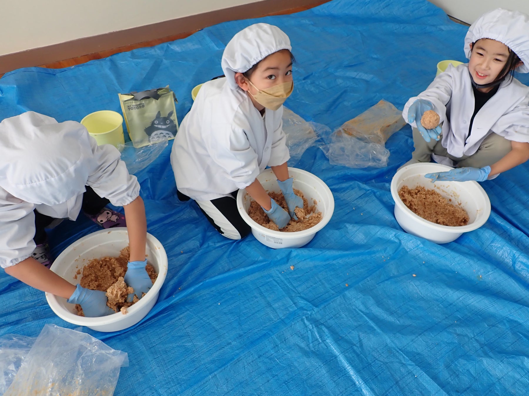 大豆をすり潰し、塩と米麹を混ぜ合わせ、力いっぱいこね上げる。「味噌を育てる気持ちで。」というアドバイスを受け、最後は空気を抜きながら自分専用の樽へ入れました。「味噌の完成は、ここからの日々が勝負。」と味噌への情熱を語ってくださった石井さん。熟成の日々を楽しみながら、6月の完成を心待ちにする子どもたちです。