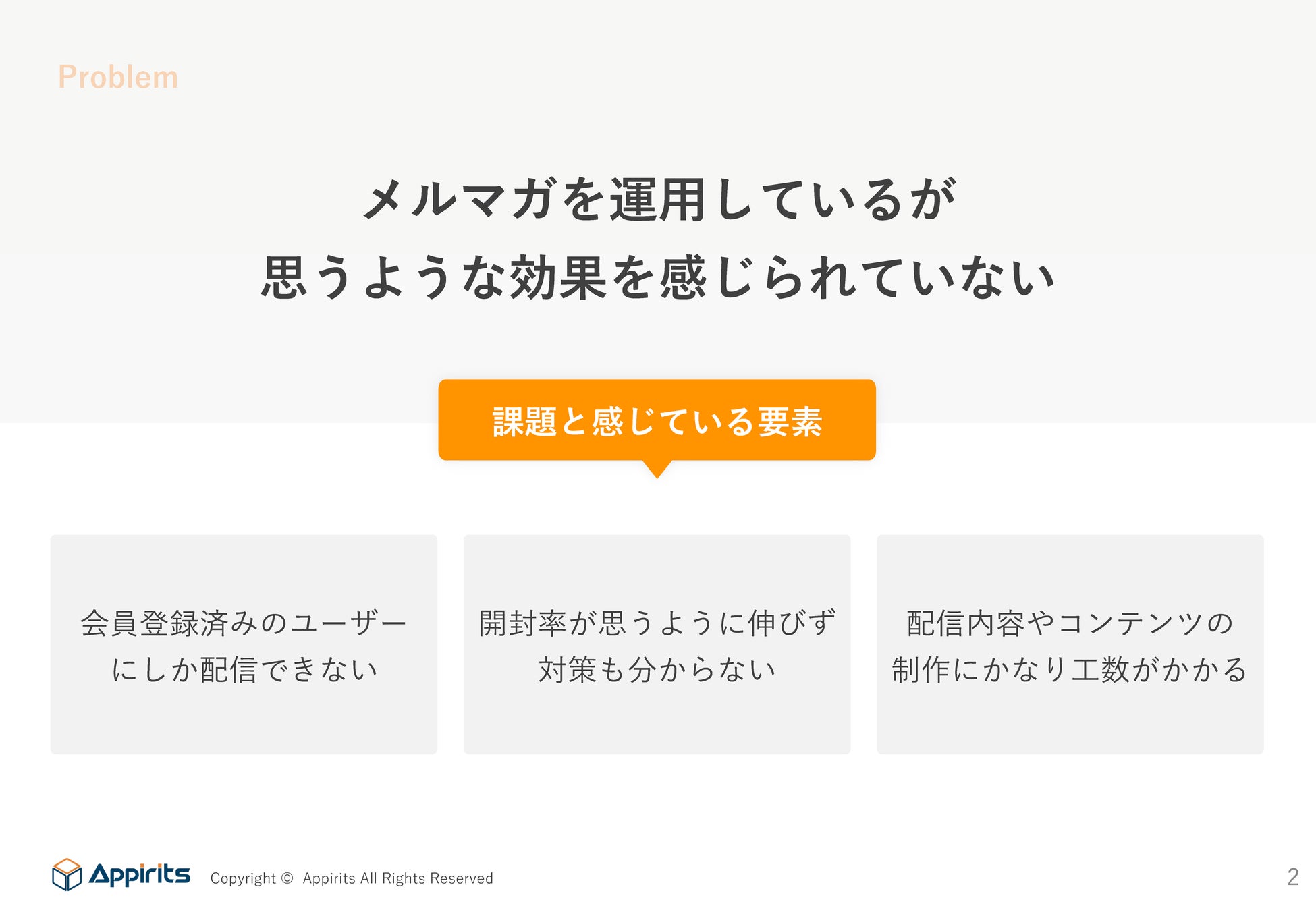 株式会社アピリッツ(本社:東京都渋谷区、代表取締役社長執行役員CEO:和田 順児)は、ECサイトやWebサイトのメルマガ運用担当者に向けて、現状のメルマガ配信に加えてプッシュ通知を併用することでより効果的なリテンションを実現するためのホワイトペーパーを公開いたしました。ECサイトなどWebビジネスで幅広く活用されているメルマガとプッシュ通知と組み合わせることによる効果をご紹介しております。ぜひご覧ください。