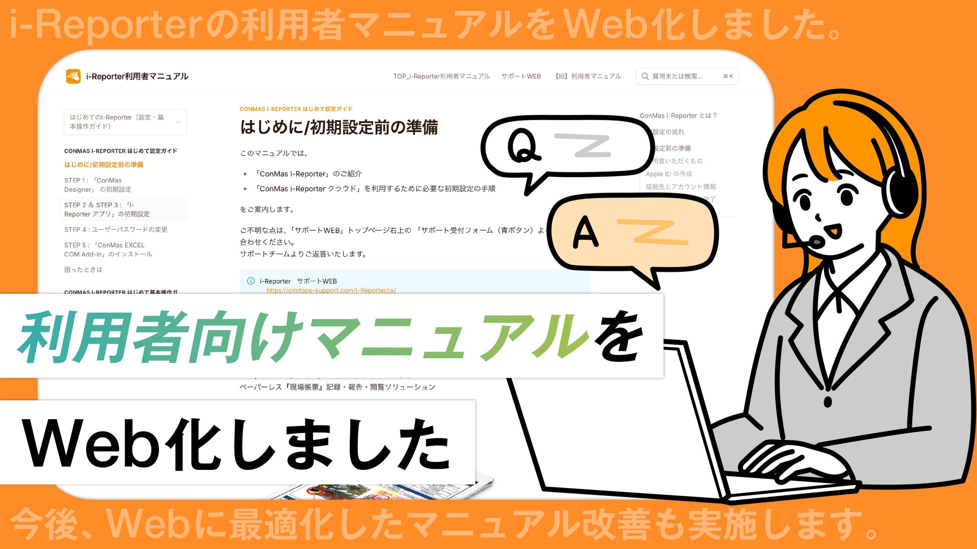 株式会社シムトップス(本社:東京都品川区、代表取締役:水野貴司)は、現場帳票システム「i-Reporter」の利用者向けマニュアルを従来のPDF形式から、Web形式へリニューアルいたしました。本取り組みは、i-Reporterユーザーが導入〜安定稼働まで様々なタイミングで直面する課題に対して、適切な情報に素早くアクセスできることを目的に実施しております。