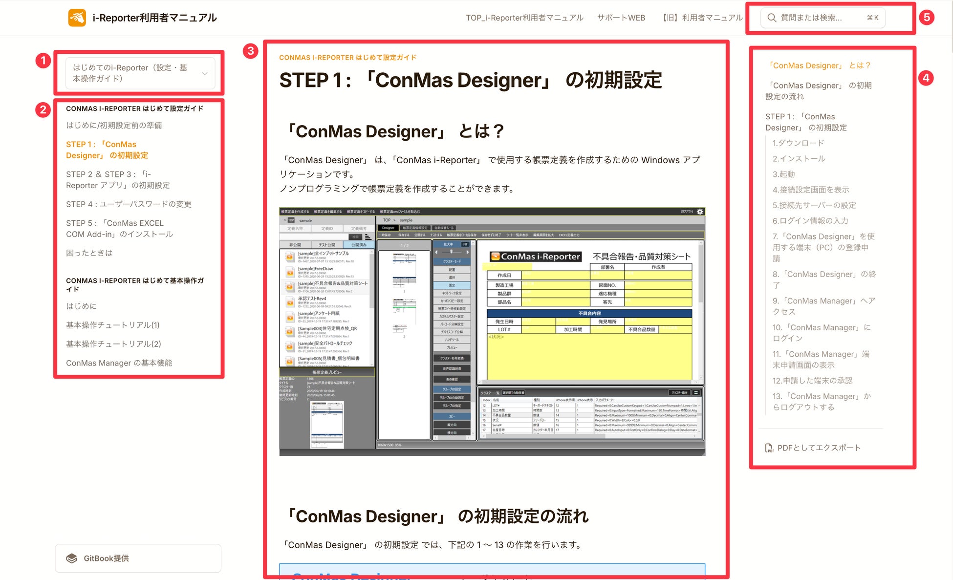 新しいi-Reporter利用者向けマニュアルはナレッジベースツール「Gitbook」を用いて制作しております。従来のPDF形式のマニュアルでは実現できなかったシームレスなマニュアル間移動や、動画等を用いた直感的な操作説明が実現できるようになりました。