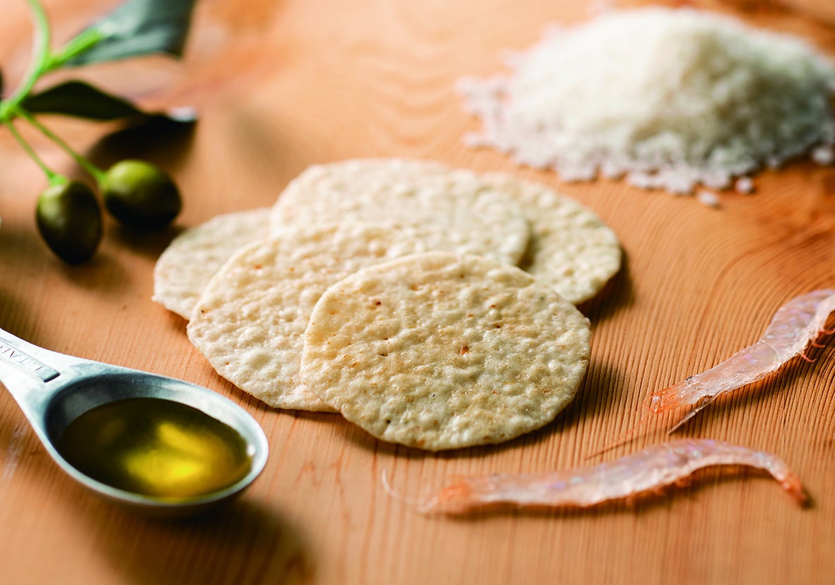 富山湾の宝石「しろえび」を、富山米100%の生地にたっぷりと練りこみました。パリッとした食感の塩味ベースのしろえびせんべいをオリーブオイルとほのかな酸味で上品な味に調えました。