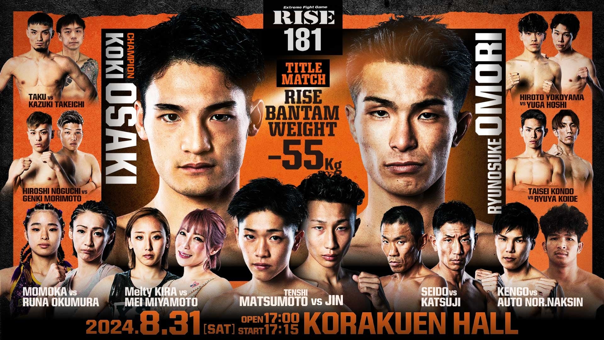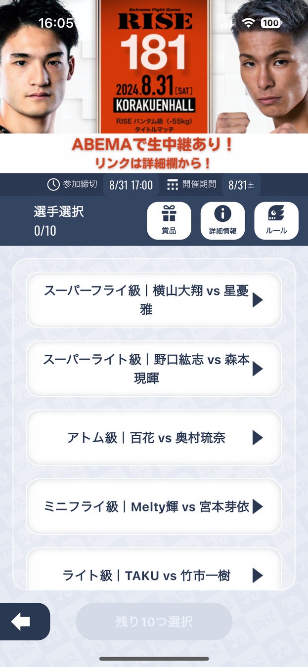 『RISE181』では、メインイベント『RISEバンタム級(-55kg)タイトルマッチ 3分5R 無制限延長R 大﨑孔稀(王者/OISHI GYM/第8代RISEバンタム級王者、BOMバンタム級王者) vs 大森隆之介(挑戦者/EX ARES/同級4位)』をはじめ、セミファイナル『-52kg契約 3分3R延長1R 松本天志(TARGET SHIBUYA/フライ級2位、RISE NEW WARRIORSフライ級トーナメント優勝) vs JIN(楠誠会館/MA日本バンタム級王者)』など、10試合を対象に勝敗予想を開催します。