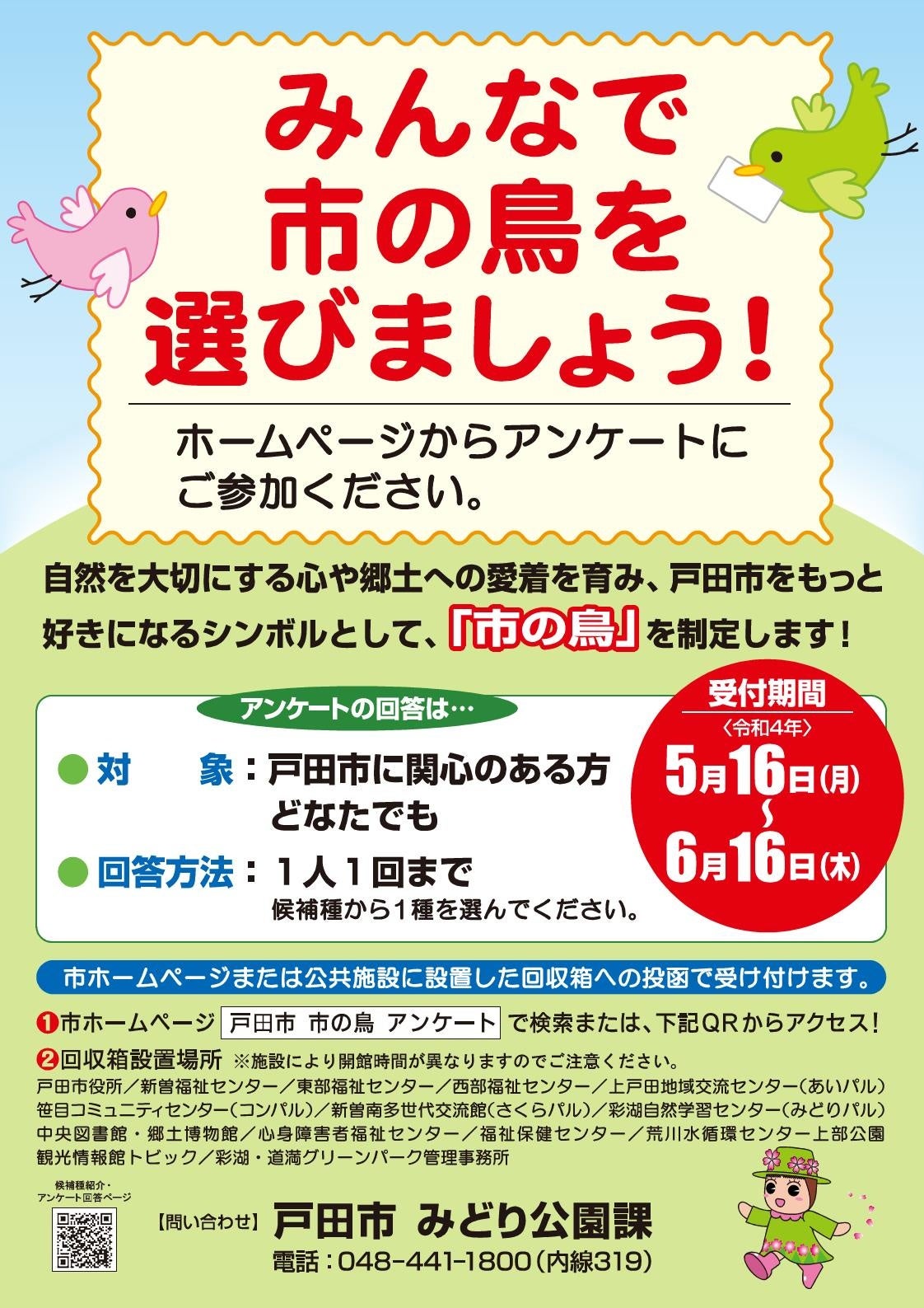 埼玉県戸田市では、自然を大切にする心や郷土への愛着を育み、市をもっと好きになるシンボルとして「市の鳥」を制定するため、アンケートを実施しています。10種の候補種から、最も多く回答を集めた候補種が「市の鳥」として決定されます。