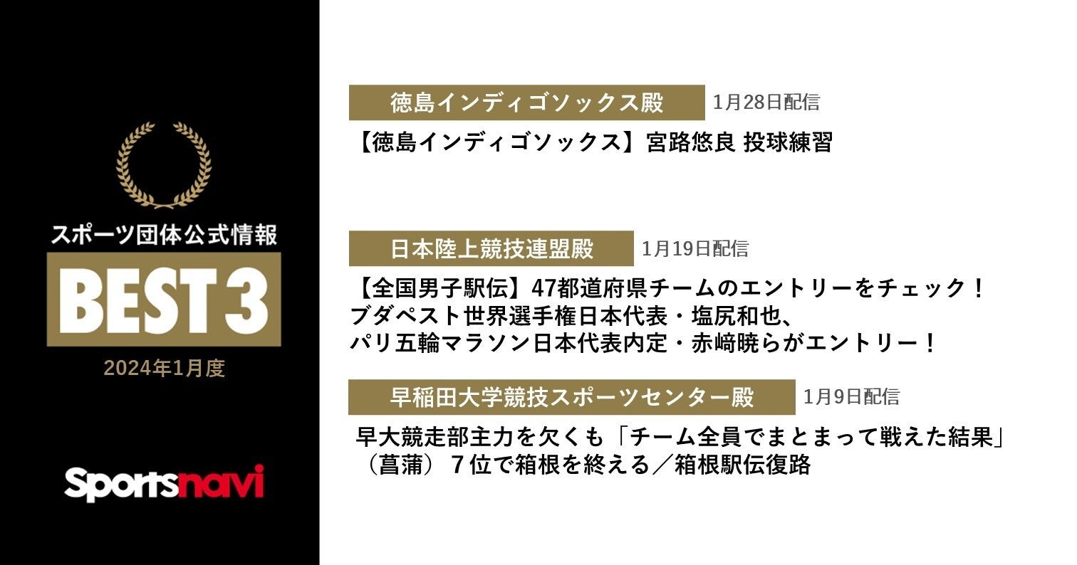 徳島インディゴソックス、日本陸上競技連盟、早稲田大学競技スポーツセンターが受賞! スポーツ団体公式情報月間ベスト3(2024年1月度)