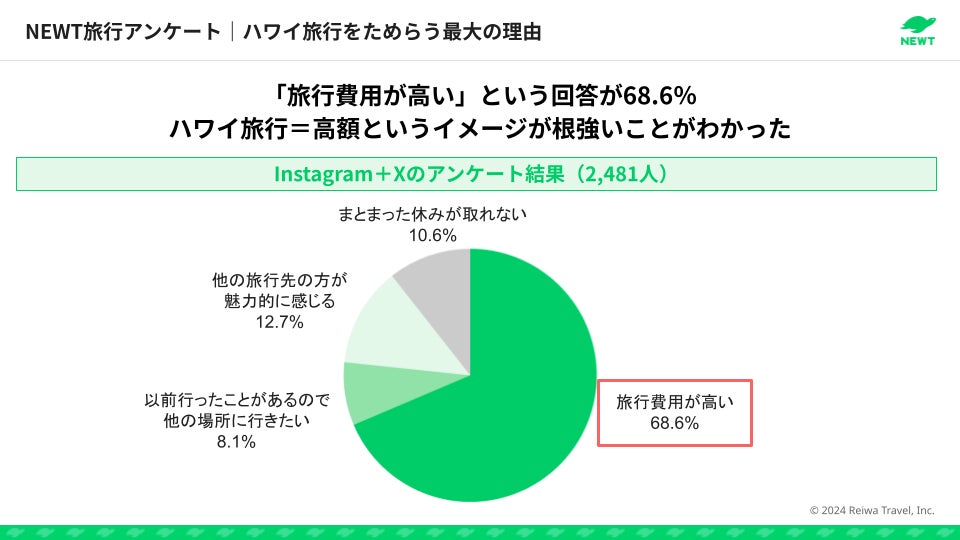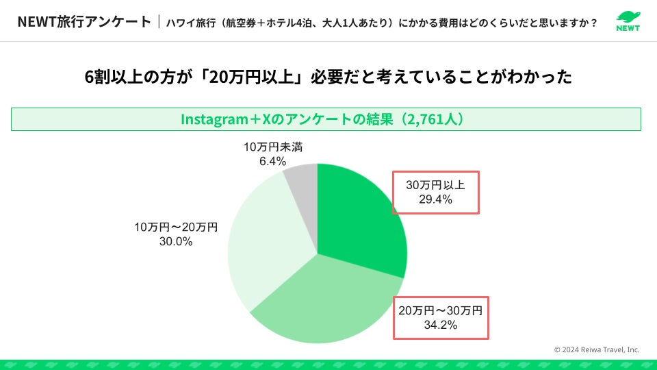 株式会社令和トラベル(本社:東京都渋谷区、代表取締役社長:篠塚 孝哉)が運営する、かしこい、おトク、旅行アプリ『NEWT(ニュート)』は、根強い人気を誇る「ハワイ旅行」に関する調査リポートを公開しました。NEWTが実施したSNSアンケートの結果を通じてハワイ旅行への意識を紐解きつつ、「ハワイ旅行は高額」という認識に対し、実際のツアーの紹介やおトクなハワイ旅行を実現するためのコツの紹介を通じて、10万円台で叶うハワイ旅行の実態に迫ります。
