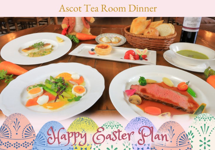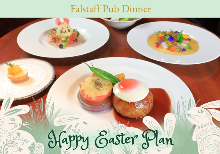 海外のイースター文化を体験できる特別宿泊プラン「ハッピーイースタープラン」を提供いたします。本プランでは、イースター仕様のコースディナーや限定アクティビティ「イースターバニーハント」への無料参加、さらにイースターバニーからのプレゼントなど、多彩な特典をご用意しております。夕食は、英国の街角にあるパブを再現した「フォルスタッフパブ」または英国のカントリーサイドを思わせる「アスコットティールーム」からお選びいただけます。