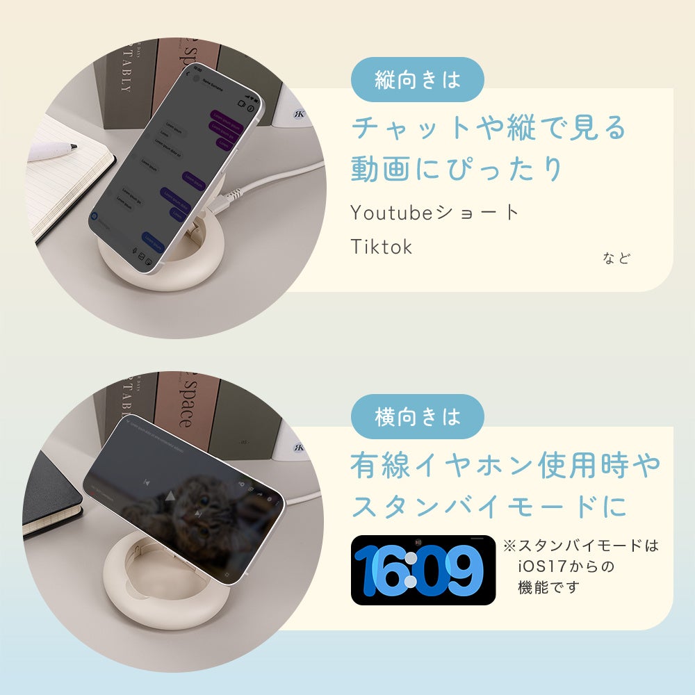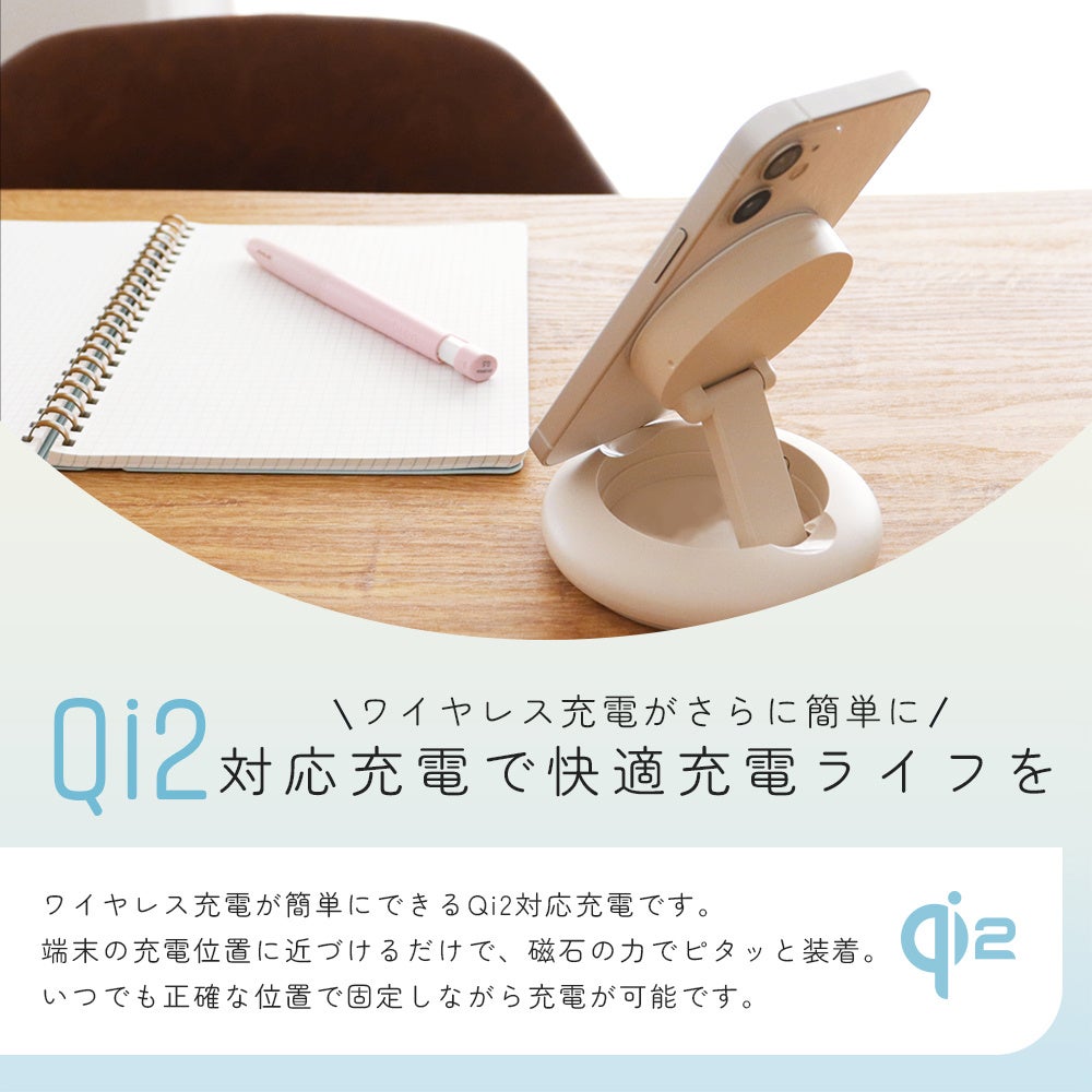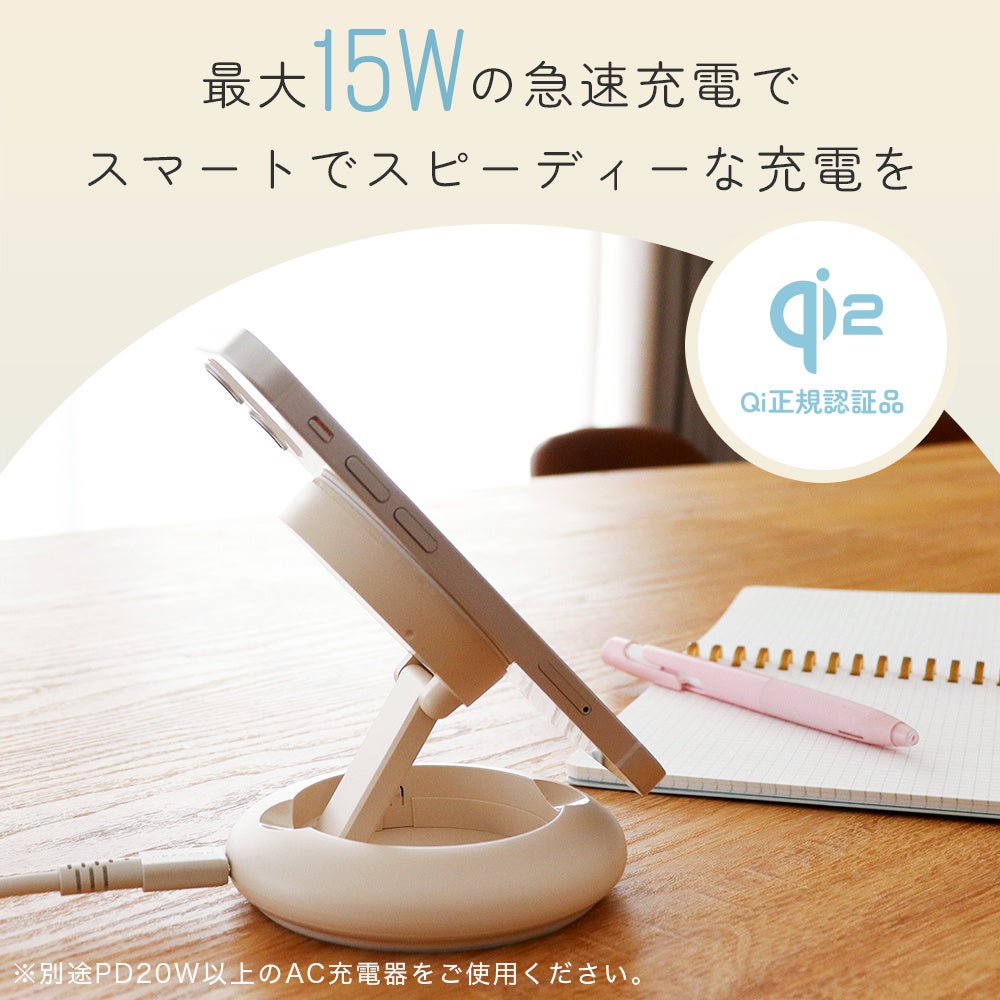 Qi2対応のマグネット式ワイヤレス充電と、高さ・角度が調整できるスタンド を一体化させた充電器です。最大15Wの急速充電が可能。マグネット式なので近づけるだけで、ピタッと充電できるのが魅力です。