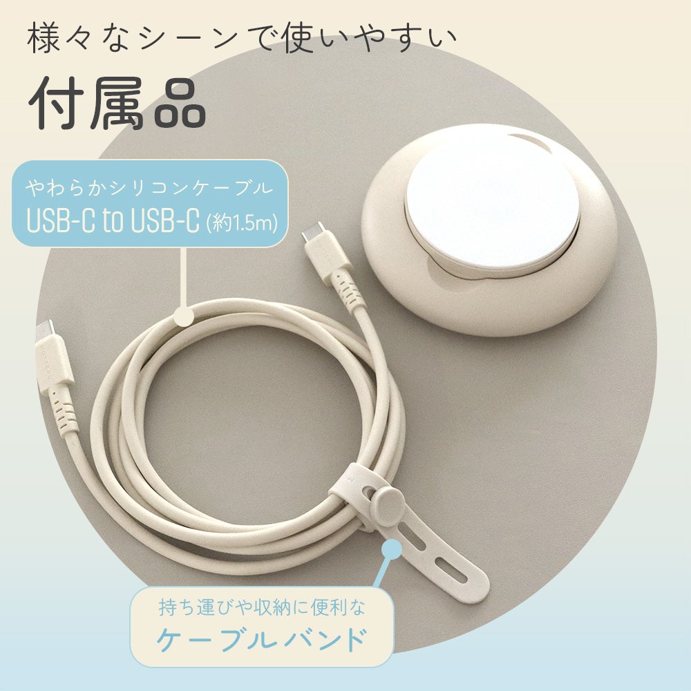 付属品には充電器と同色のUSB-C to USB-Cケーブル(約1.5m)が付属しております。デスク周りやベッド周りなど「いつもの充電場所」でお使いいただけるだけでなく、ケーブルバンドも付属しているので、持ち運びや収納も楽々です。