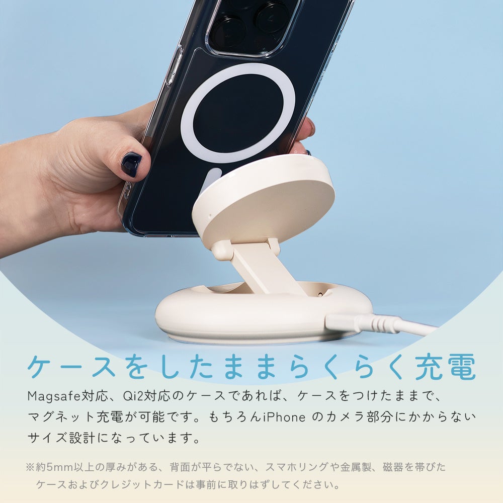 また、Magsafe対応・Qi2対応のケースをご使用の場合、ケースをつけたままでマグネット充電が可能です。