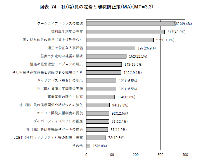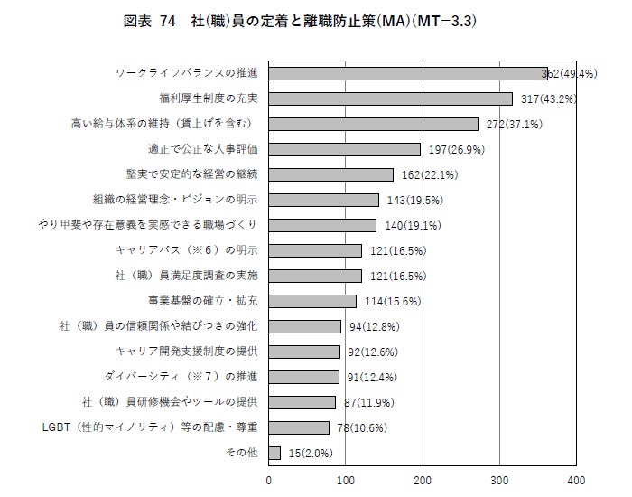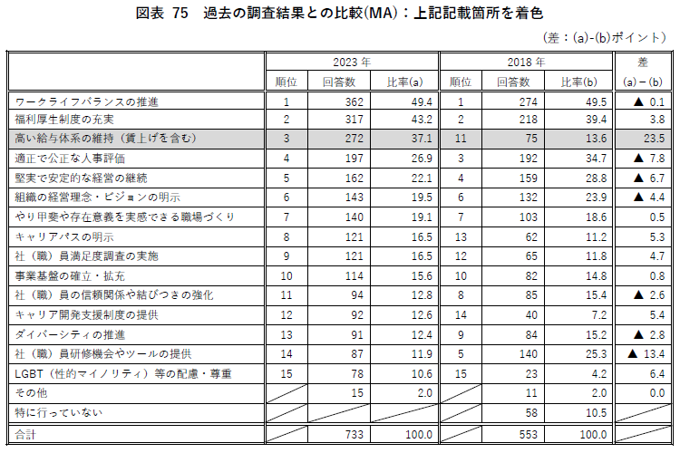 社員の定着と離職防止策については「WLBの推進(1位)」「福利厚生の充実(2位)」は前回同様となったが、「高い給与体系の維持(賃上げを含む)(前回11→3位)」と大きく順位を上げた。