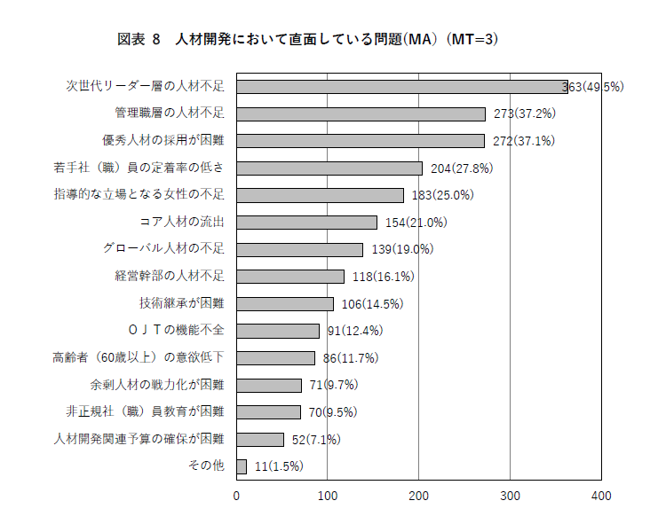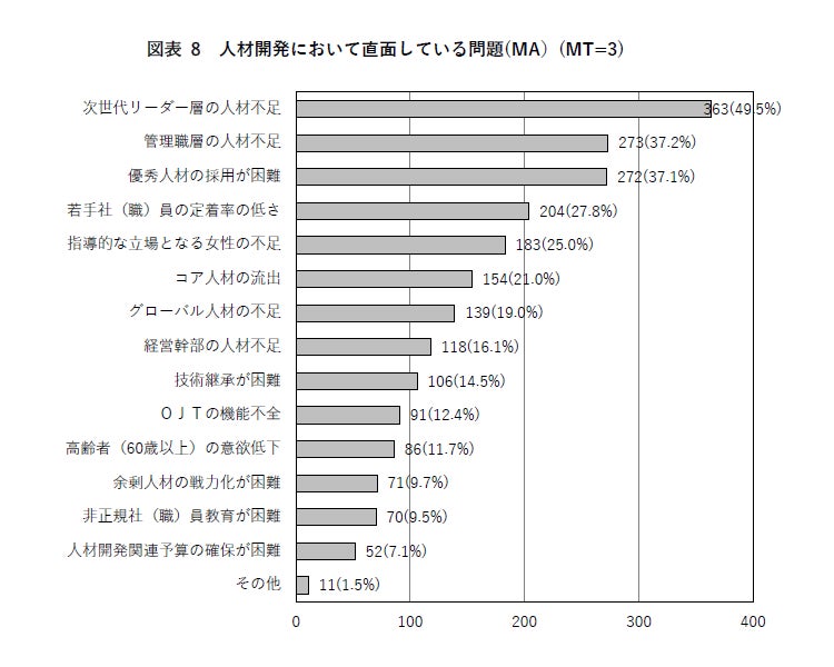 人材育成の課題では「若手社(職)員の定着率の低さ」「コア人材の流出」が順位を上げる