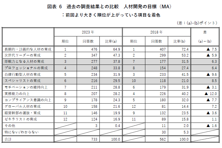 人材育成の目標は「即戦力」「プロフェッショナル」「スペシャリスト」の育成が順位を上げた