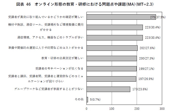 オンラインによる教育・研修についてコロナ前(2019年12月以前)と比較すると、7割以上が「増えた」と回答している。オンライン教育に関しての課題については「受講者が真剣に取り組んでいるかどうかの確認が難しい」「機材や施設、通信ツール、受講場所などの環境整備に費用がかかる」「通信環境、アクセス、機器などのトラブルが多い」が上位となっている。