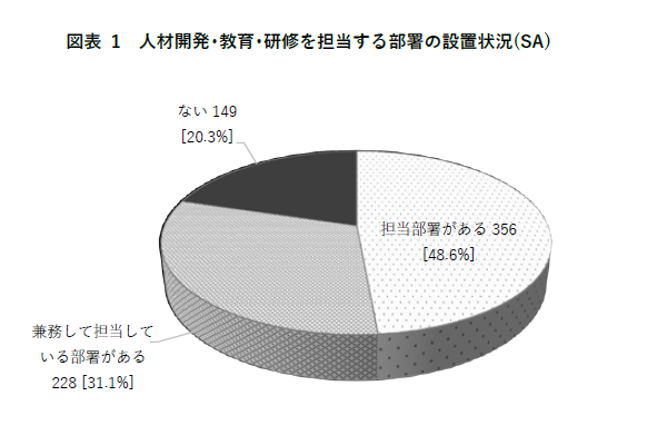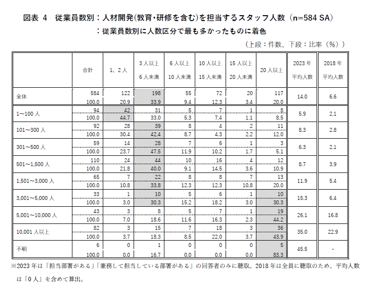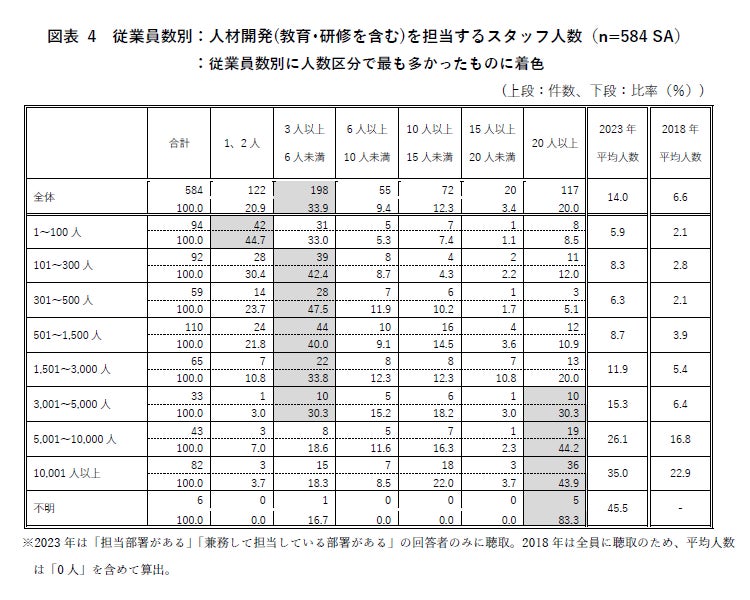 人材開発を担当する部署の有無については、約8割があると回答している(担当部署がある:48.6% 兼務している部署がある:31.3%)。該当部署のスタッフ数は14.0人で、前回調査(2018)の6.6人から大きく増加した。