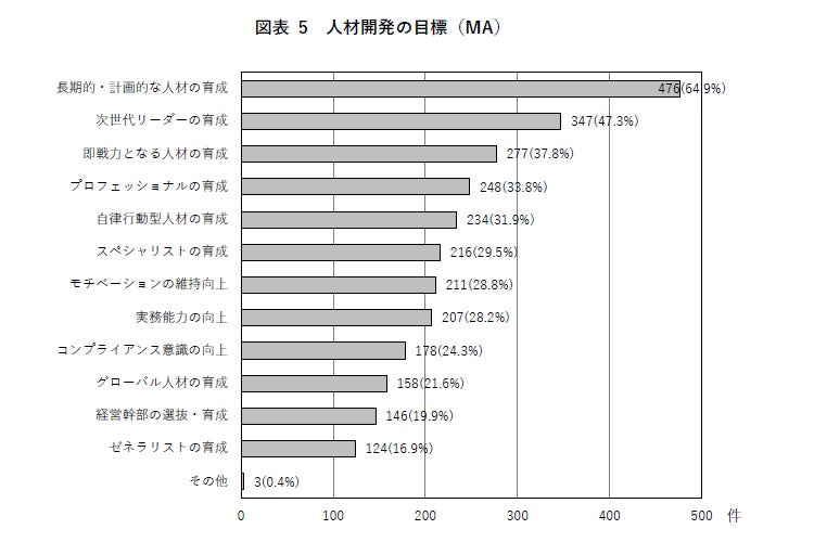 人材開発の目標については「長期的・計画的な人材の育成」「次世代リーダーの育成」が上位2つで、前回結果と同様である。コロナ前からの変化は「即戦力となる人材の育成(前回7→3位)」「プロフェッショナルの育成(前回8→4位)」「スペシャリストの育成(前回10→6位)」となった。教育ニーズの変化がうかがえる。