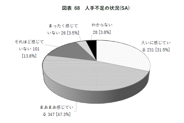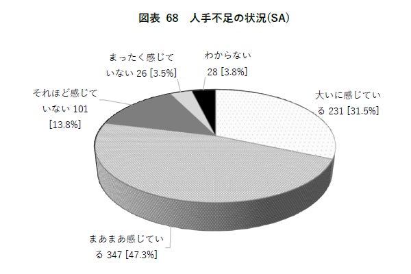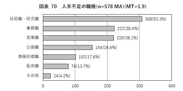 人手不足の状況に関しては約8割の人手不足を感じている。職種別では「技術職・研究職」が最も高い。