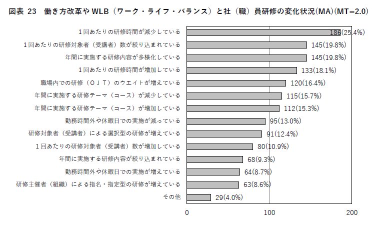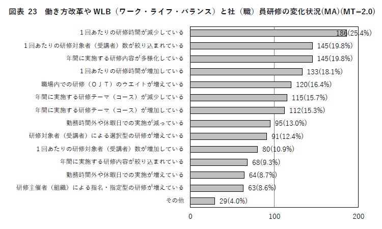 働き方改革やWLBと研修の変化についての質問では「1回あたりの研修時間が減少している(1位)」「1回あたりの研修時間が増加している(4位)」と研修時間の増減が上位となった。