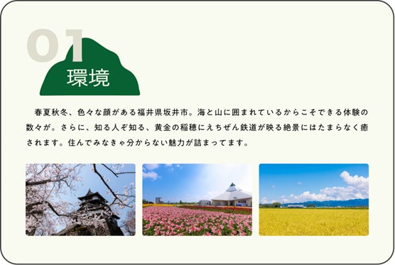 坂井市は福井県の北部に位置し、平成18年3月20日に坂井郡の 三国町・丸岡町・春江町・坂井町、4町が合併して誕生しました。 坂井市の全体のうち、約34%を田畑が、約30%を山林が占めて おり、豊かな自然環境に恵まれています。総人口は88,055人、 世帯数は33,859世帯。(※令和7年6月1日現在)