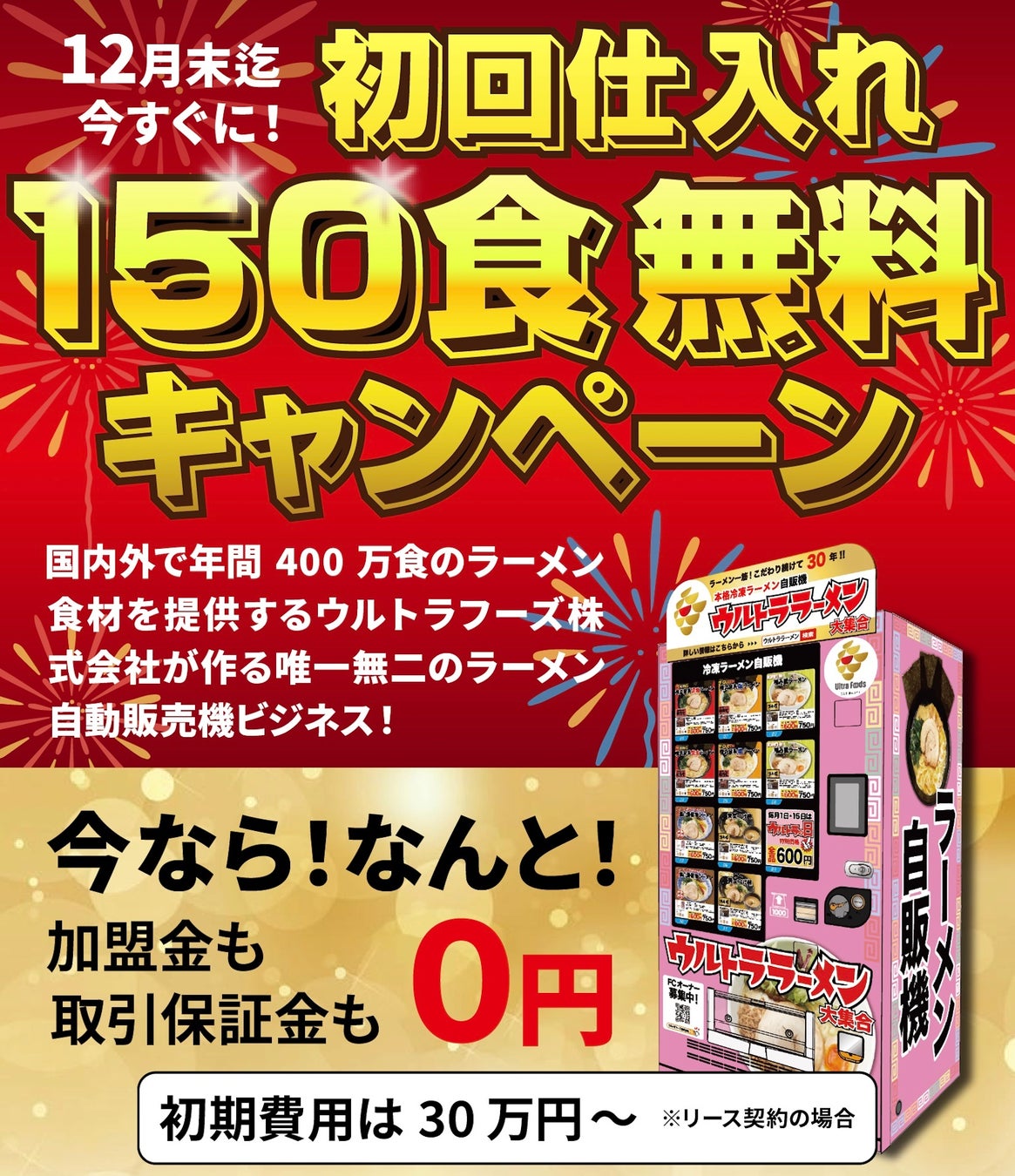 冷凍ラーメン自販機のオーナー募集 【12月末までにご契約のお客様限定】 初回仕入れ分のラーメン150食 無料プレゼントキャンペーン開催中