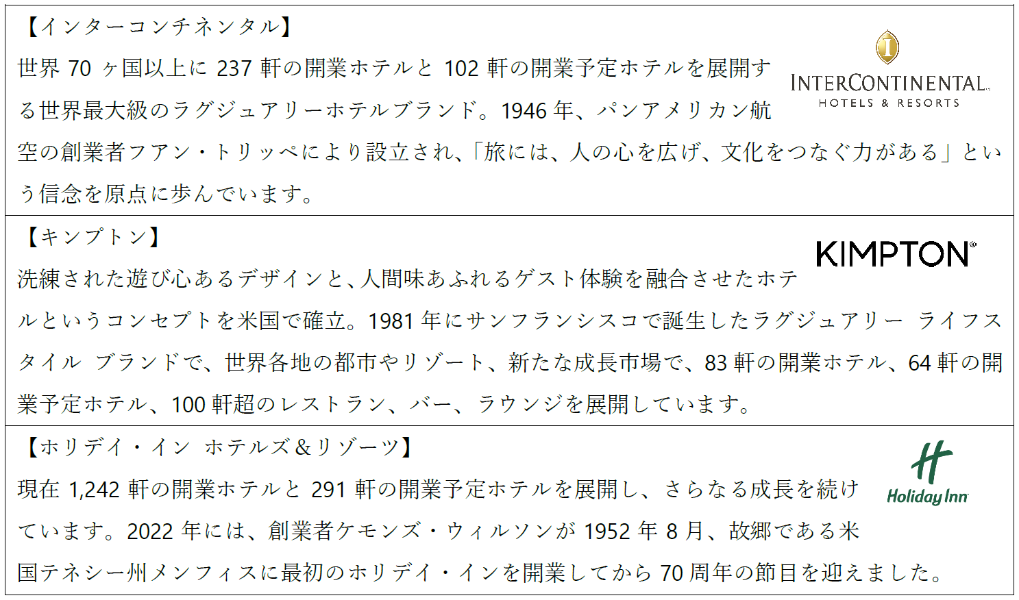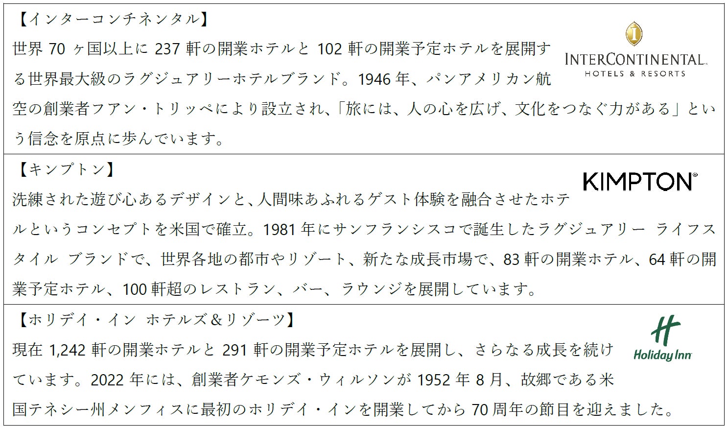• プレミアム: voco, Ruby, HUALUXE ホテルズ&リゾーツ, クラウンプラザ ホテルズ&リゾーツ, EVEN ホテルズ