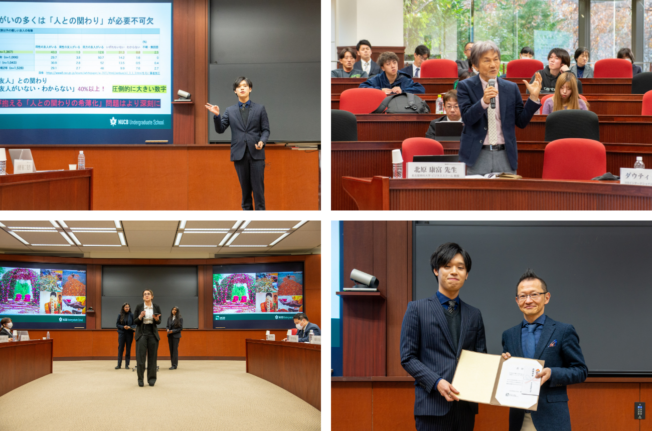最優秀賞には、経営学部3年の星野晃杜さんの『お年寄りの輝く未来を見つける職業体験型屋内テーマパーク「アルテニアAltenia」』が選ばれました。審査員の講評では、名古屋商科大学ビジネススクール北原教授から「社会価値を経済的価値に変換することは非常に難しい。その難しい点にこそ、皆さんのアイデアが入る余地や価値があると思う。その困難を乗り越えてソーシャルビジネスに発展するモデルを皆さんのアイデアで実現しほしい。」と参加学生を激励しました。