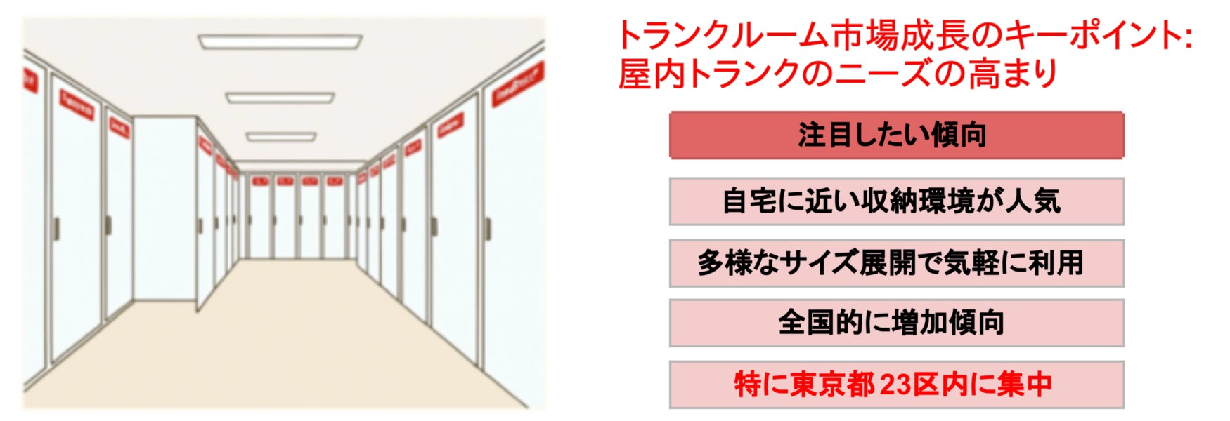 屋内トランクは自宅と類似した屋内保管環境で「自宅のクローゼットの延長」として人気があるだけでなく、空調やセキュリティなどの付加価値を強みに成長しており、自宅の収納スペース不足・ゆとり不足を補いたいと考えている方のニーズに合致しているといえます。