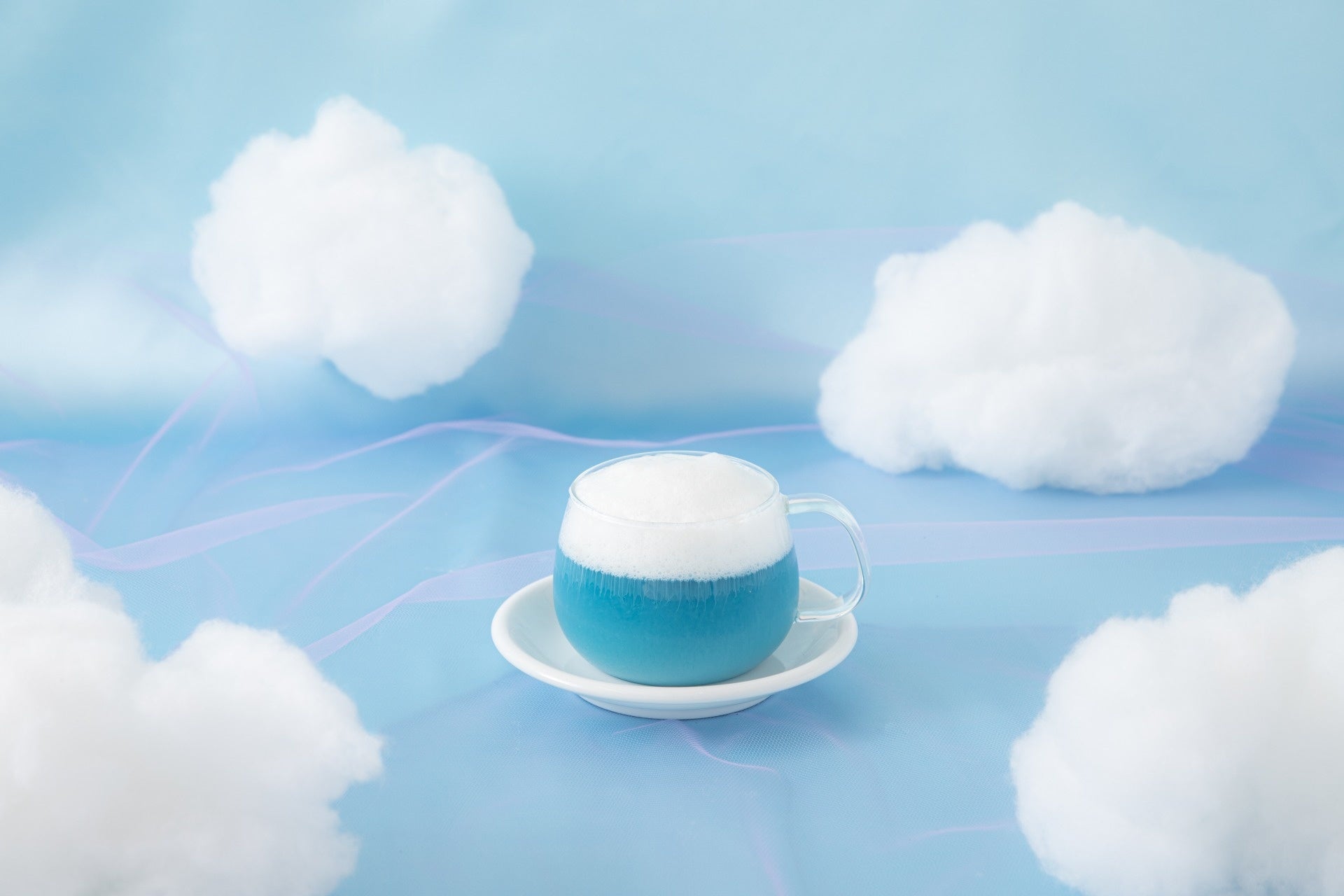 ミルクフォームで雲をイメージした空色のホットバタフライピーティー。