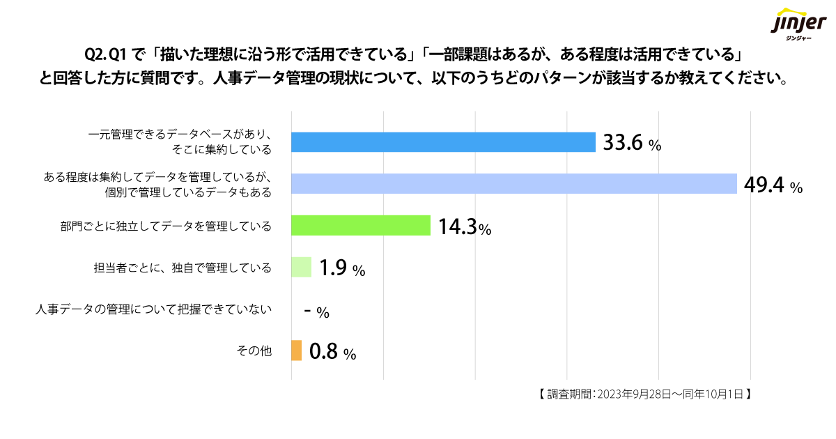 「描いた理想に沿う形で活用できている」、「一部課題はあるが、ある程度は活用できている」と回答した企業のうち、人事データを管理する方法について質問したところ、最も多かった回答は「ある程度集約してデータを管理しているが、個別で管理しているデータもある(49.4%)」、次いで「一元管理できるデータベースがある(33.6%)」となりました。