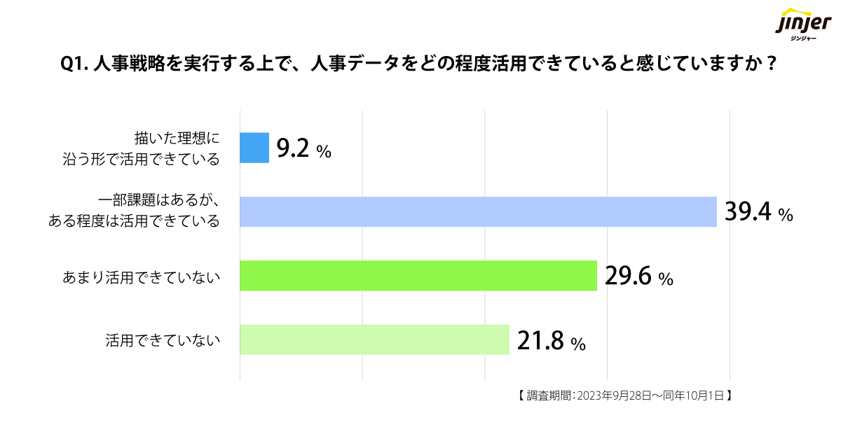 人事戦略を実行する上で、人事データをどの程度活用できているかに関する質問をしたところ、「描いた理想に沿う形で活用できている(9.2%)」と答えた企業が全体の10%を下回る結果となりました。次いで「一部課題はあるが、ある程度活用できている(39.4%)」、「あまり活用できていない(29.6%)」、「活用できていない(21.8%)」と、人事データを活用できていない企業の回答が約50%となりました。