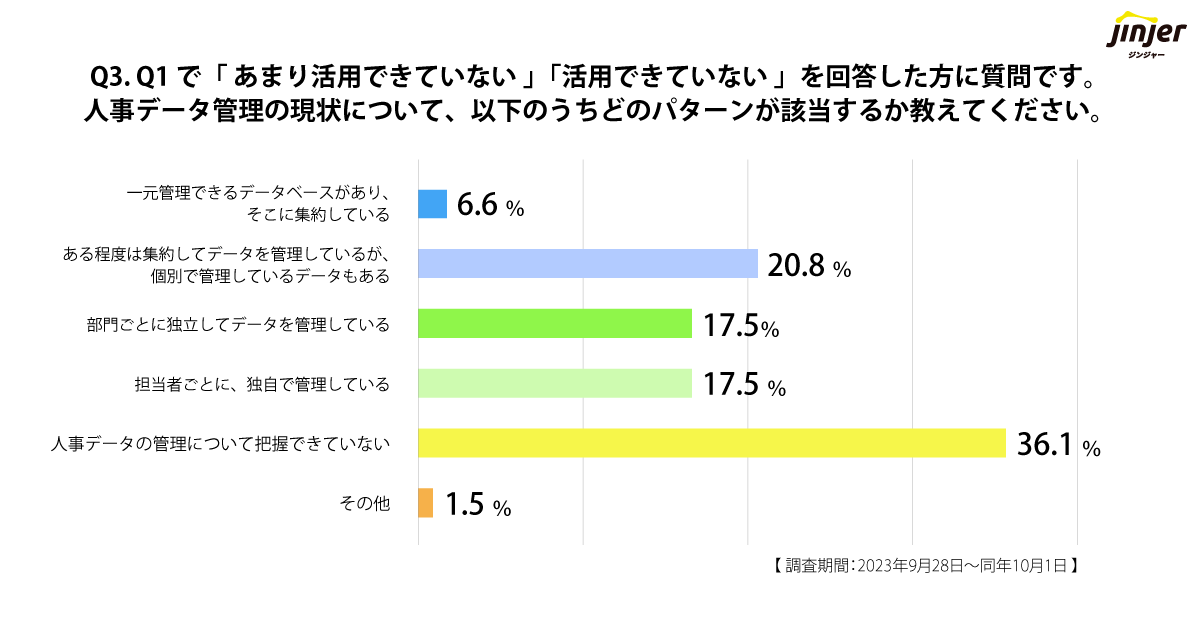 対照的に、Q1で「あまり活用できていない」、「活用できていない」と回答した企業へ、人事データを管理する方法について質問したところ、最も多かった回答は「人事データの管理について把握できていない」が36.1%、次いで「部門ごとに独立してデータを管理している」、「担当者ごとに独自で管理している」が17.5%(同率)と、併せて企業の35%が人事データの管理元がバラバラであることがわかりました。