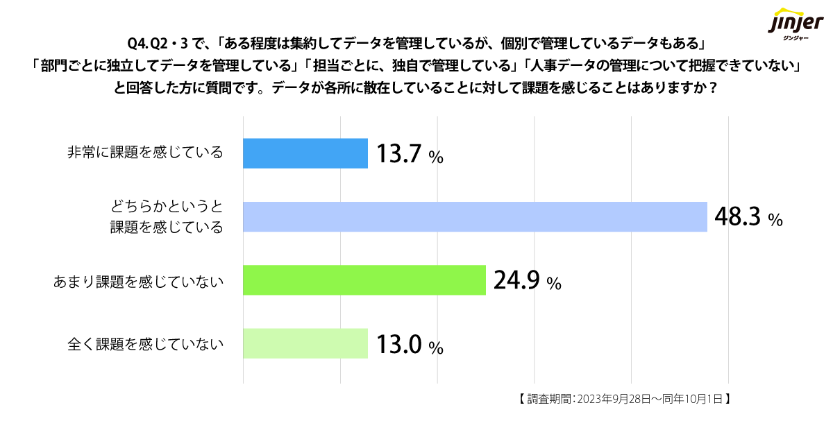 Q2・Q3で、人事データを独立して管理している企業を対象に、各所にデータが散在していることに対する課題感を聞いたところ、「非常に課題を感じている(13.7%)」「どちらかというと課題を感じている(48.3%)」と、併せて約60%が課題を感じていることがわかりました。
